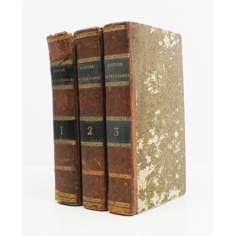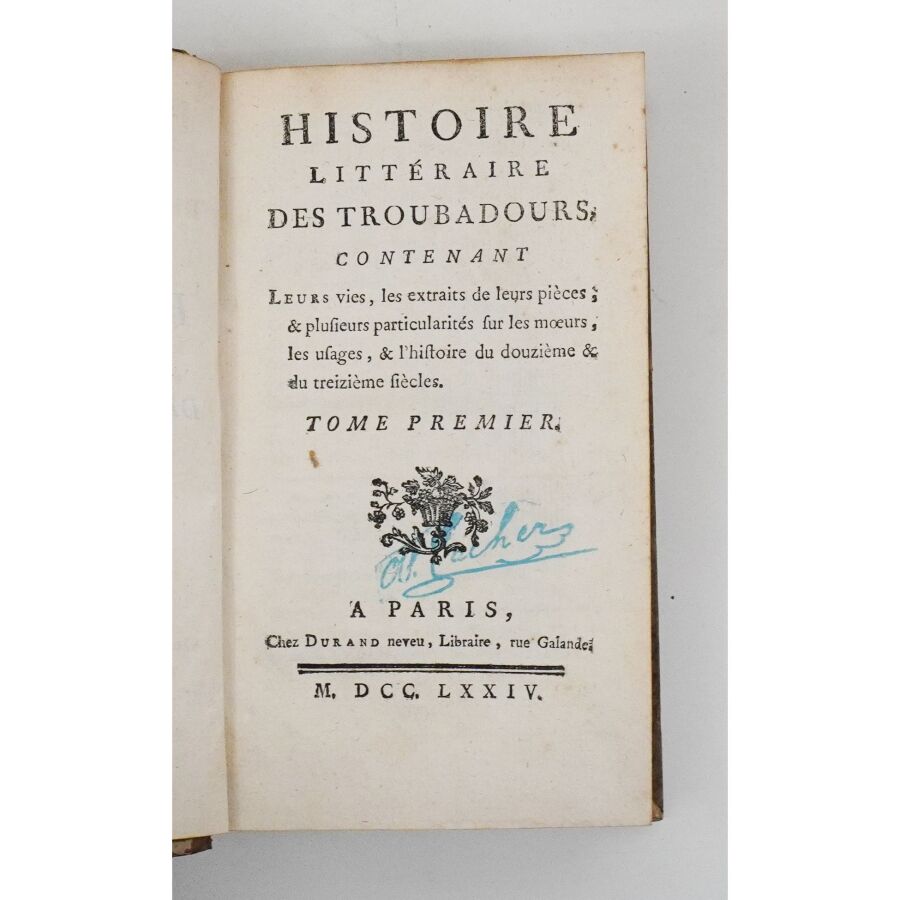 SAINT-PALAYE (J. B) & MILLOT (A.). Histoire littéraire des troubadours, contenant leurs vies, les extraits de leurs pièces ; & plusieurs particularités sur les moeurs, les usages, & l'histoire du douzième & du treizième siècles. Paris, Durand, 1774. 3 vol. in-12, demi-veau brun, dos lisse orné, pièces de titre et de tomaison (reliure de l'époque).