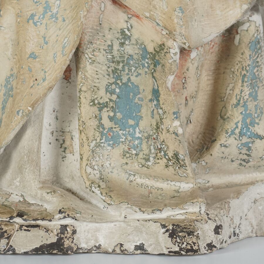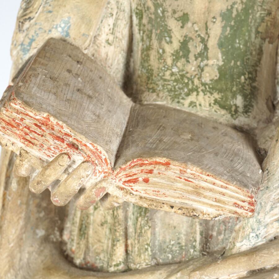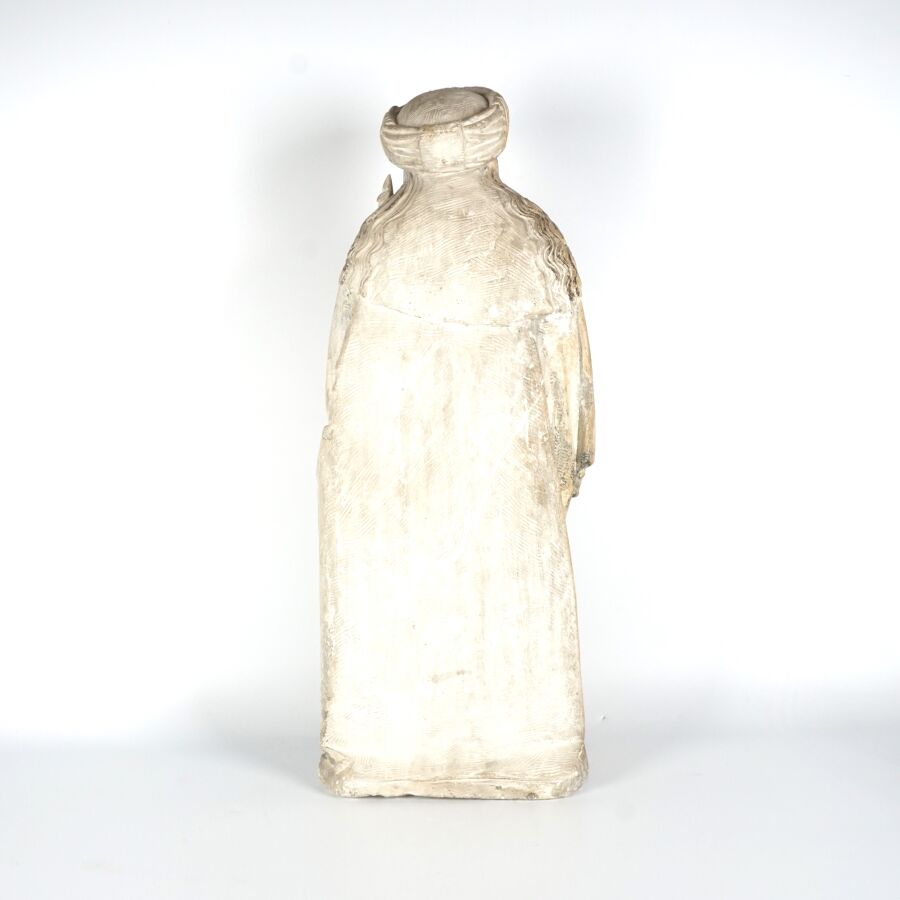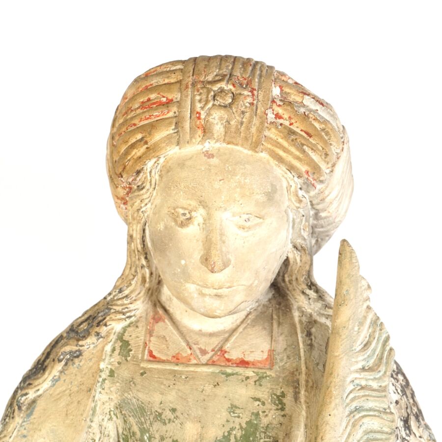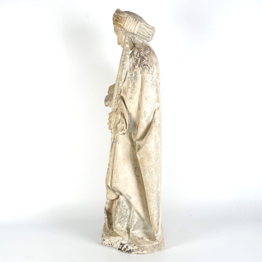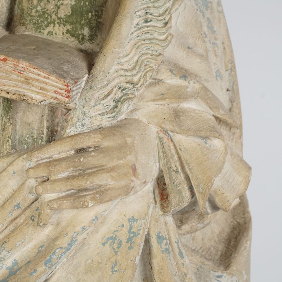 Sainte Femme en pierre calcaire sculptée avec restes de polychromie, représentée debout, coiffée d'un turban, elle est vêtue d'une robe ceinturée et d'un manteau dont elle retient un pan sur le devant ; elle tient un livre ouvert de sa main droite et la palme du martyre de l'autre, Burgundo-champenois, vers 1500, H. 53 cm (légers accidents et manques).