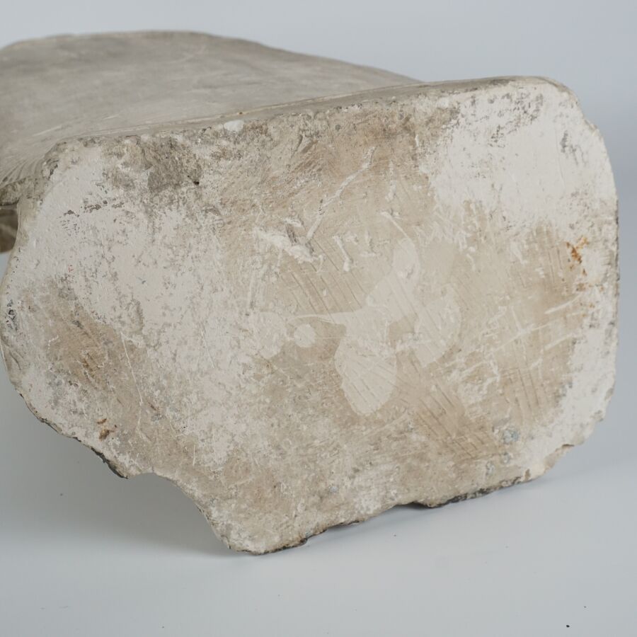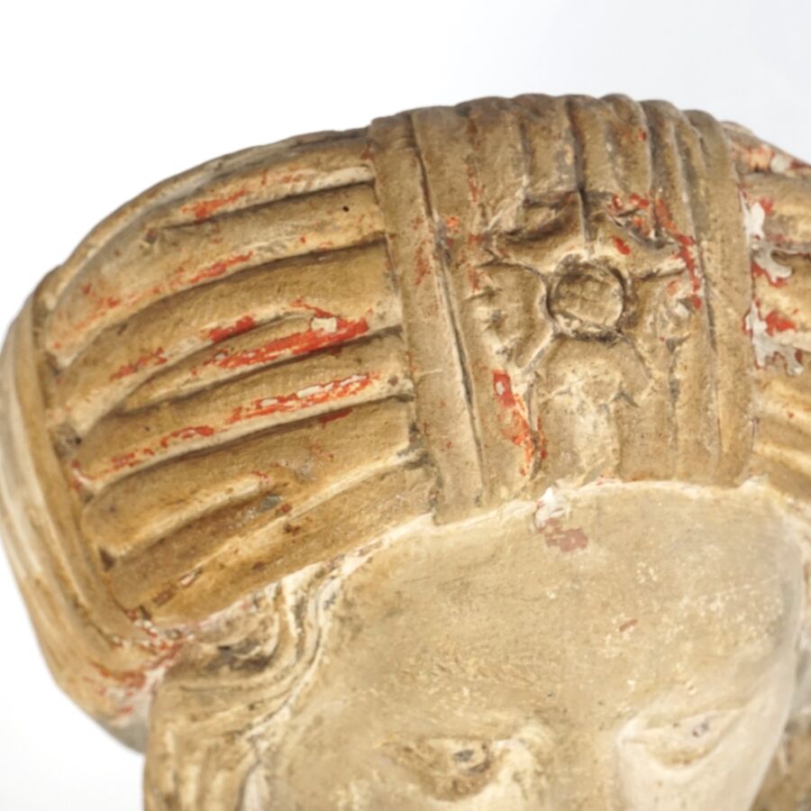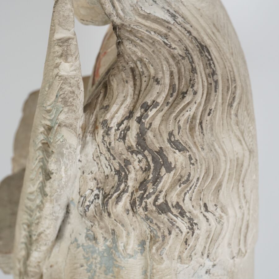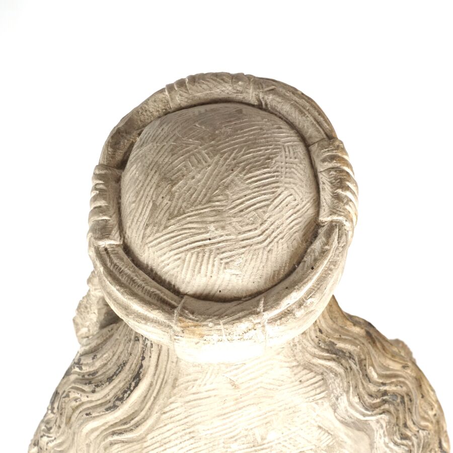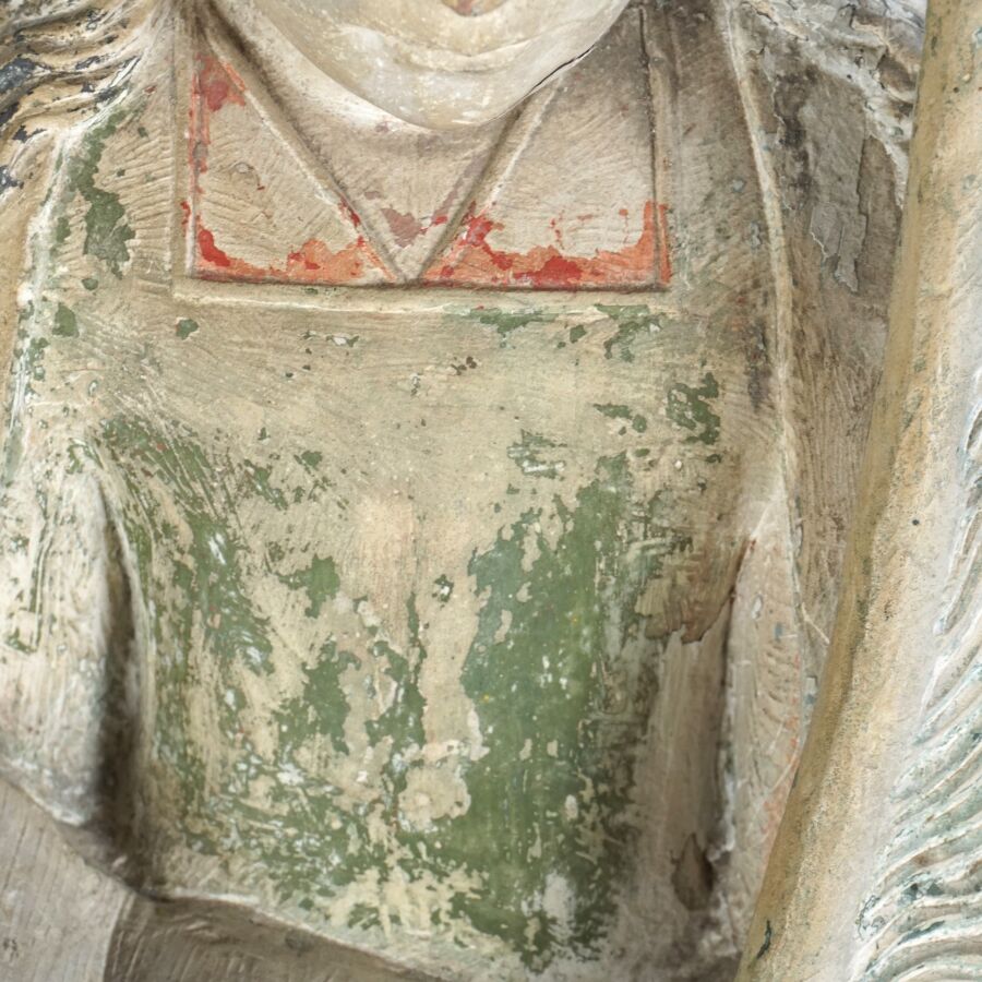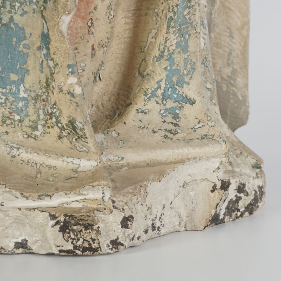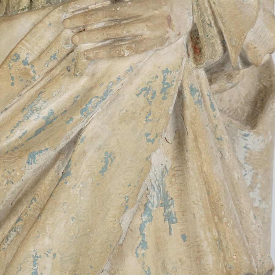Sainte Femme en pierre calcaire sculptée avec restes de polychromie, représentée debout, coiffée d'un turban, elle est vêtue d'une robe ceinturée et d'un manteau dont elle retient un pan sur le devant ; elle tient un livre ouvert de sa main droite et la palme du martyre de l'autre, Burgundo-champenois, vers 1500, H. 53 cm (légers accidents et manques).