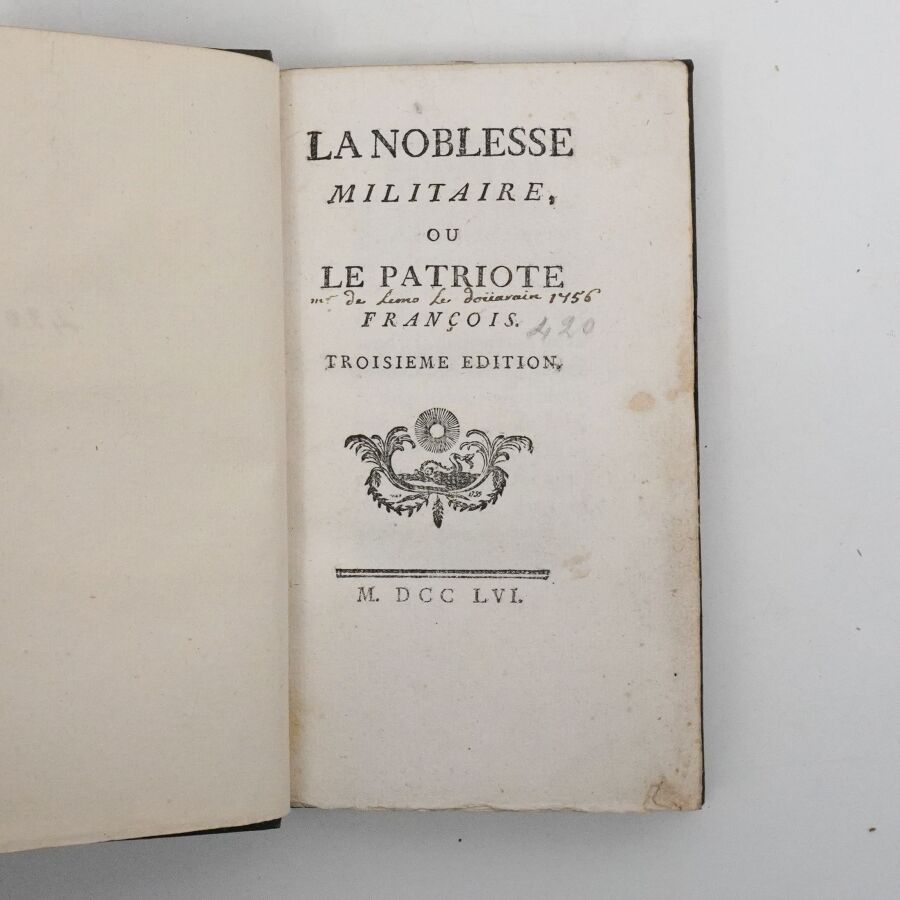 [SAINTE-FOIX, chevalier d'ARCQ (Philippe Auguste de)]. La Noblesse militaire ou le Patriote françois. Troisième édition. sl, sn, 1756. In-12 de v-[1]-210 pp. L'une des nombreuses réfutations des thèses développées par l'abbé Coyer dans La Noblesse commerçante ; l'auteur développe la nécessité de ne pas écarter la noblesse de sa vocation propre, qui est la guerre. (Barbier III, 418.)