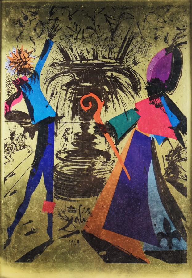 Salvador DALI (1904-1989), "Diable et évêque", affiche sur papier doré, signature estampée au centre et datée 1969, 58 x 40 cm (petites usures).
