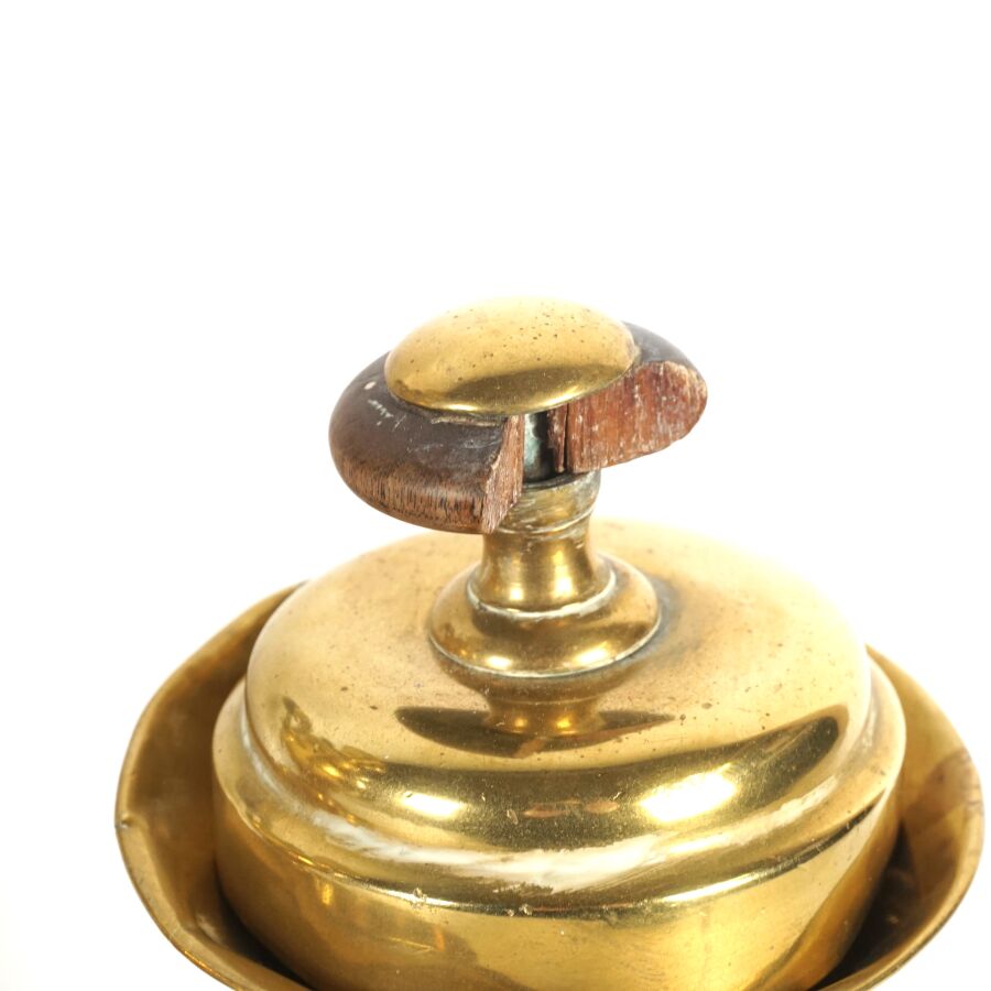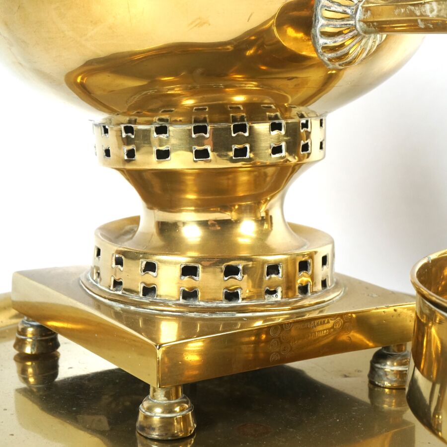 Samovar en cuivre, prises en bois, présenté avec son plateau et sa coupelle, porte une marque à l'aigle bicéphale avec inscription en cyrillique, marqué en lettres arabes au dos, Russie, H. Totale : 52 cm (déformations et petits manques au couvercle).