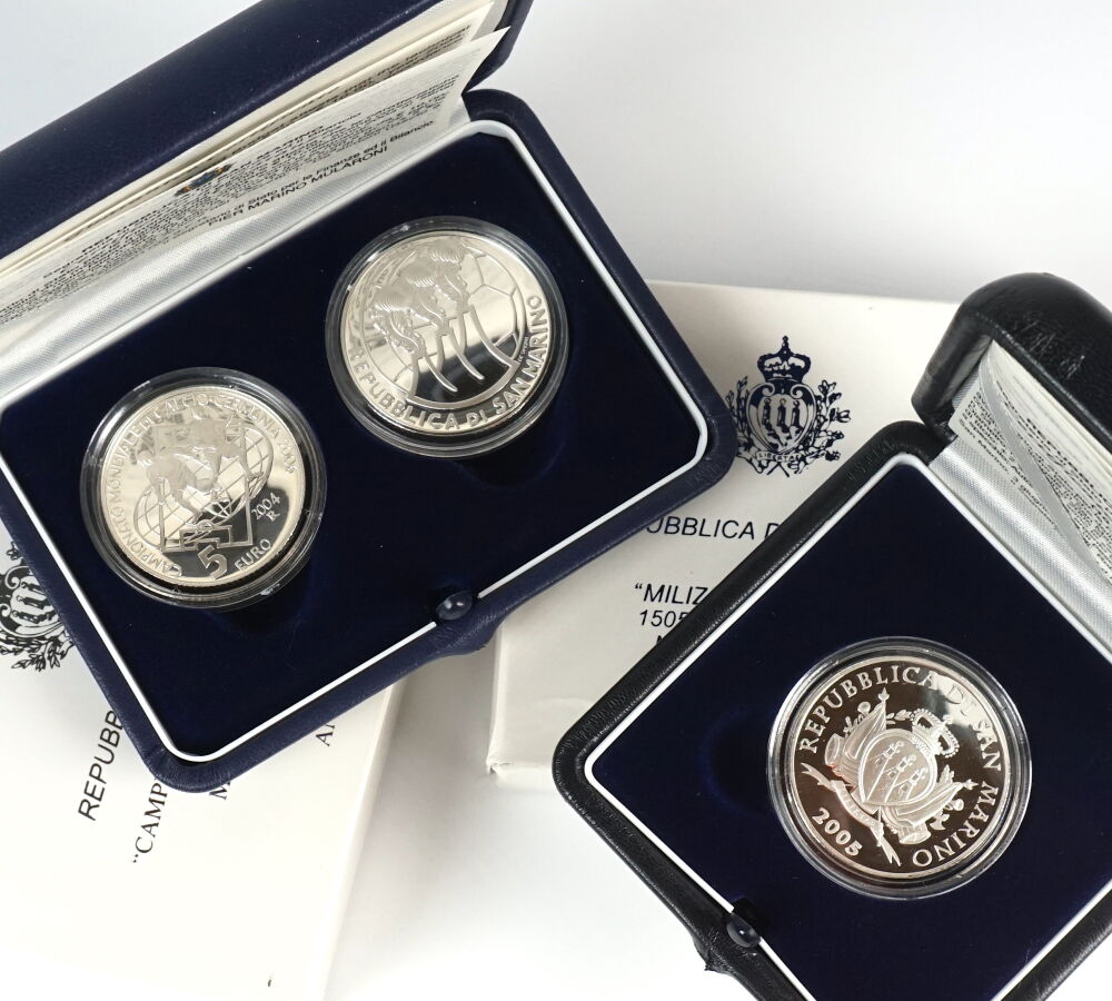 San Marin : Ensemble de 2 coffrets comprenant 10 € argent 2005 "Milizia Uniformata" 500e anniversaire + coffret 5€ et 10€ argent 2004 "Campionato Mondiale Di Calcio Germania 2006".