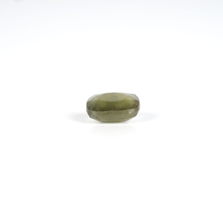 Saphir vert facetté sur papier, de taille coussin mixte calibrant 8.93 cts environ (D. 1.3 x 0.95 cm), Poids brut : 1.8 g environ (inclusions et égrisures).