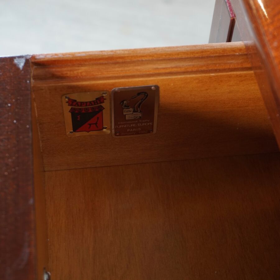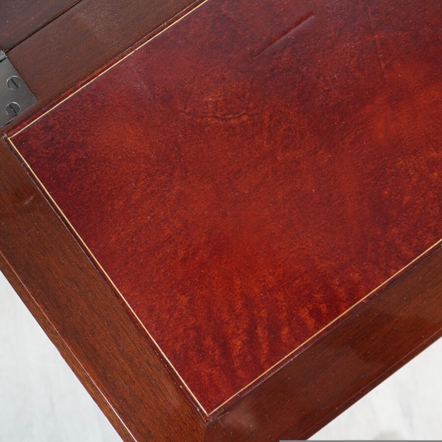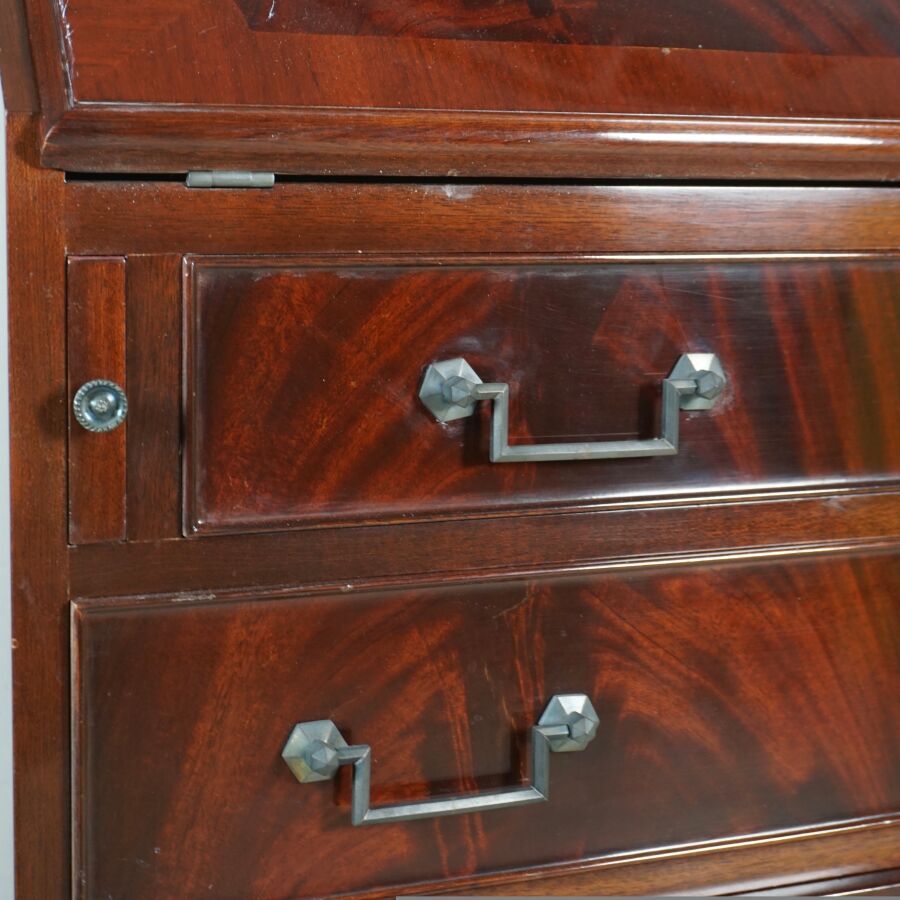 SARIDIS : Bureau scriban en bois verni et bois de placage, ouvrant en partie haute à un abattant découvrant six casiers, un vantail et quatre tiroirs, plateau gainé de cuir rouge, et ouvrant en partie basse à quatre tiroirs et deux tirettes support-plateau, Dim. 96.8 x 75 x 41.8 cm (avec sa clé, légères rayures d'usage).