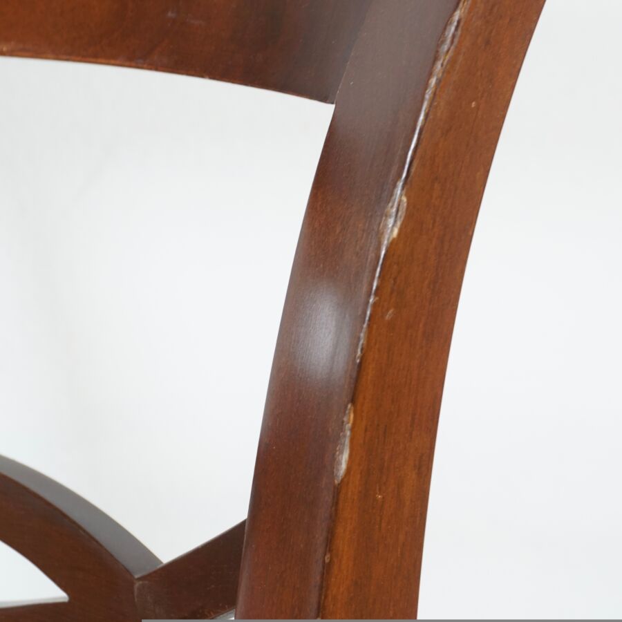 SARIDIS : Suite de six chaises en bois verni, dossier ajouré à motif d'un entrelacs, piètement arrière coupe sabre et piètement avant gaine, garniture couverte de tissu beige à motif de rosaces, H. 84.4 cm (légers petits éclats, rayures d'usage et quelques tâches).