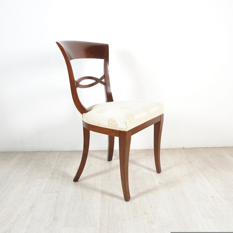 SARIDIS : Suite de six chaises en bois verni, dossier ajouré à motif d'un entrelacs, piètement arrière coupe sabre et piètement avant gaine, garniture couverte de tissu beige à motif de rosaces, H. 84.4 cm (légers petits éclats, rayures d'usage et quelques tâches).