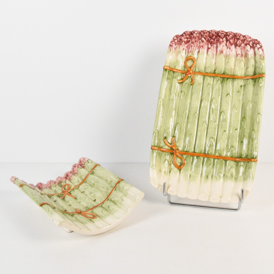 SARREGUEMINES : Plat à asperges et son égouttoir, en barbotine polychromée, D. 32 cm.