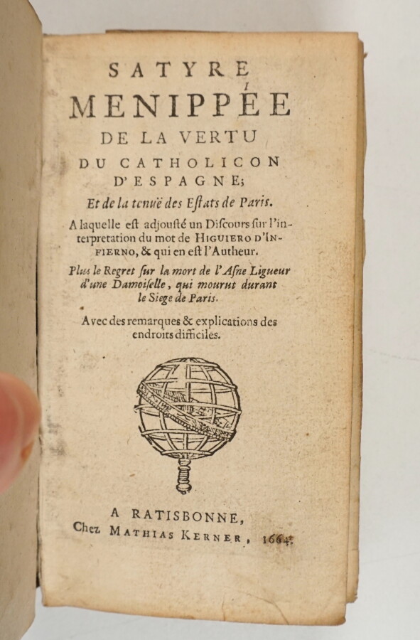 [SATYRE] - Satyre Ménippée de la vertu du catholicon d'Espagne, et de la tenue des estatz de Paris. À laquelle est adjousté un discours sur l'interprétation du mot de Higuiero d'Infierno, & qui en est l'autheur. Plus le regret sur la mort de l'asne ligueur d'une demoiselle qui mourut durant le siège de Paris [] - Ratisbonne [Bruxelles] ; Mathias Kerner [Foppens], 1664 - 1 volume petit In-12° - Sphère armillaire gravée au titre, 1 planche gravée dépliante représentant la procession de la Ligue (2 petites déchirures sans perte) - Reliure de l'époque vélin ivoire (brunie uniformément, dos légèrement décollé du corps de l'ouvrage, coin supérieur du 1er plat coupé) - Dos lisse titré et daté à l'encre noire - Tranches rouges - Ex-libris gravé au 1er contre : G. Grappe.