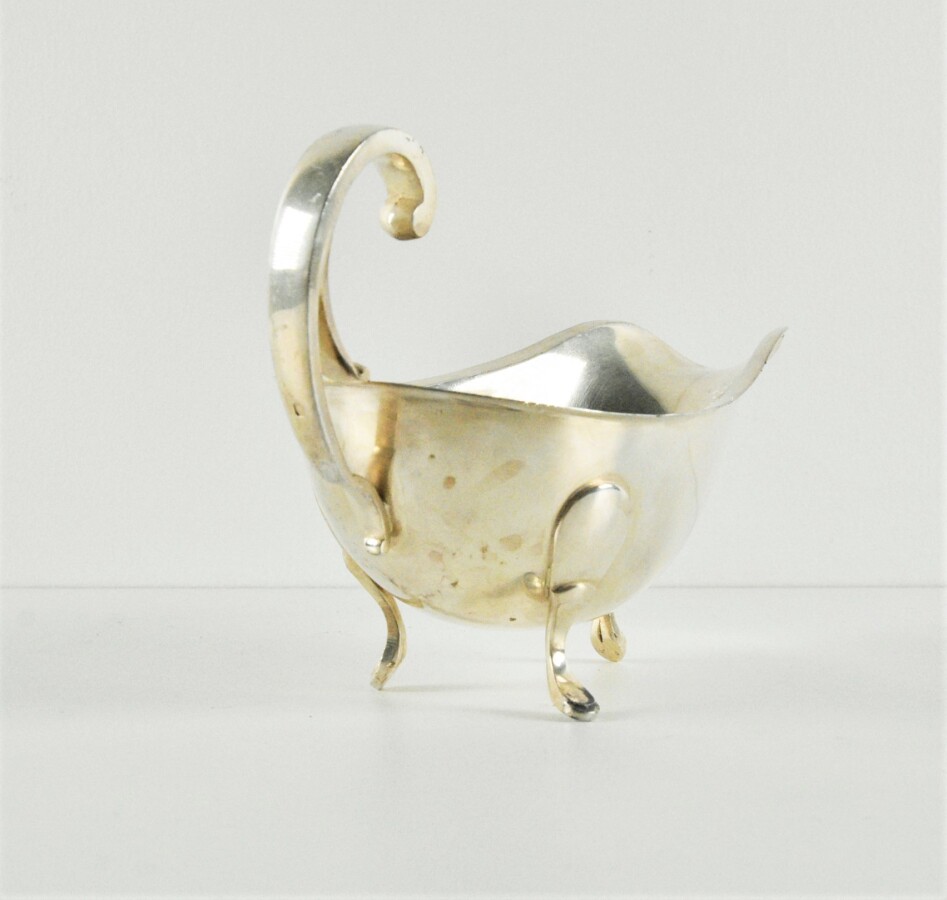Saucière de style étrusque en argent, poinçon Minerve, reposant sur 3 pieds, L. 17 cm. Poids brut : 200 g environ.