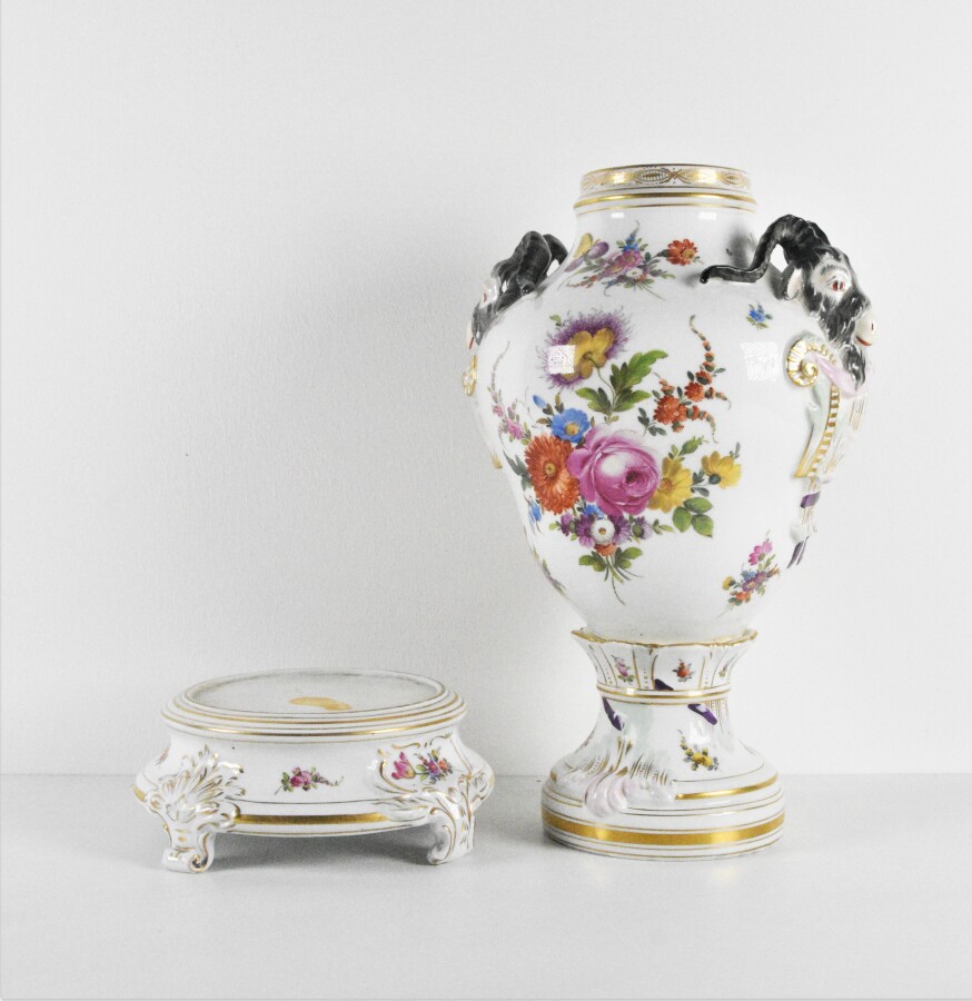 SAXE - DRESDEN : Vase de forme balustre sur socle en porcelaine émaillée polychrome à décor de scène galante, de fleurs et de mascarons en tête de bouc, monogrammé "PL", 20e siècle, H. avec socle : 40 cm.