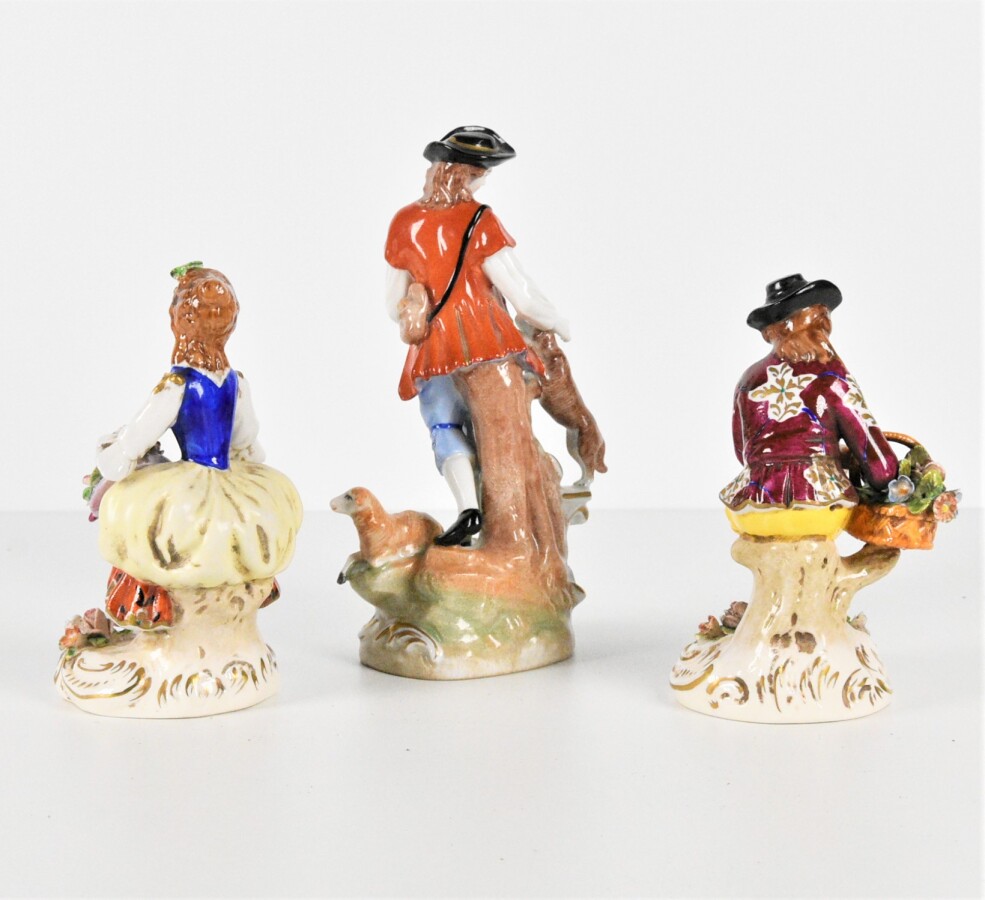 SAXE : Ensemble de trois petits sujets en porcelaine émaillée polychrome figurant un couple cueillant des fleurs et un jeune berger jouant avec son chien, diverses marques dessous, 20e siècle, H. 11.5 et 15.5 cm.
