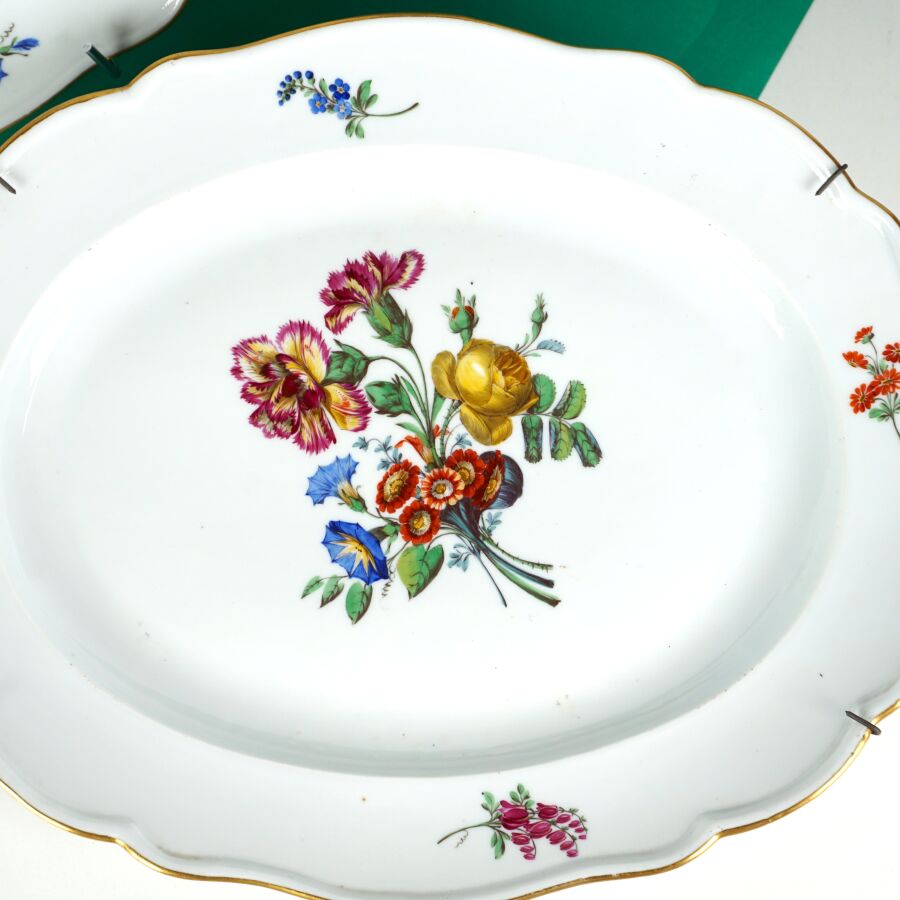 SAXE : Paire de plats de forme ovale en porcelaine émaillée polychrome à décor de bouquets de fleurs, bordure polylobée rehaussée à l'or, marqués au-dessous au tampon en bleu de la double épée croisée, L. 39.8 cm.