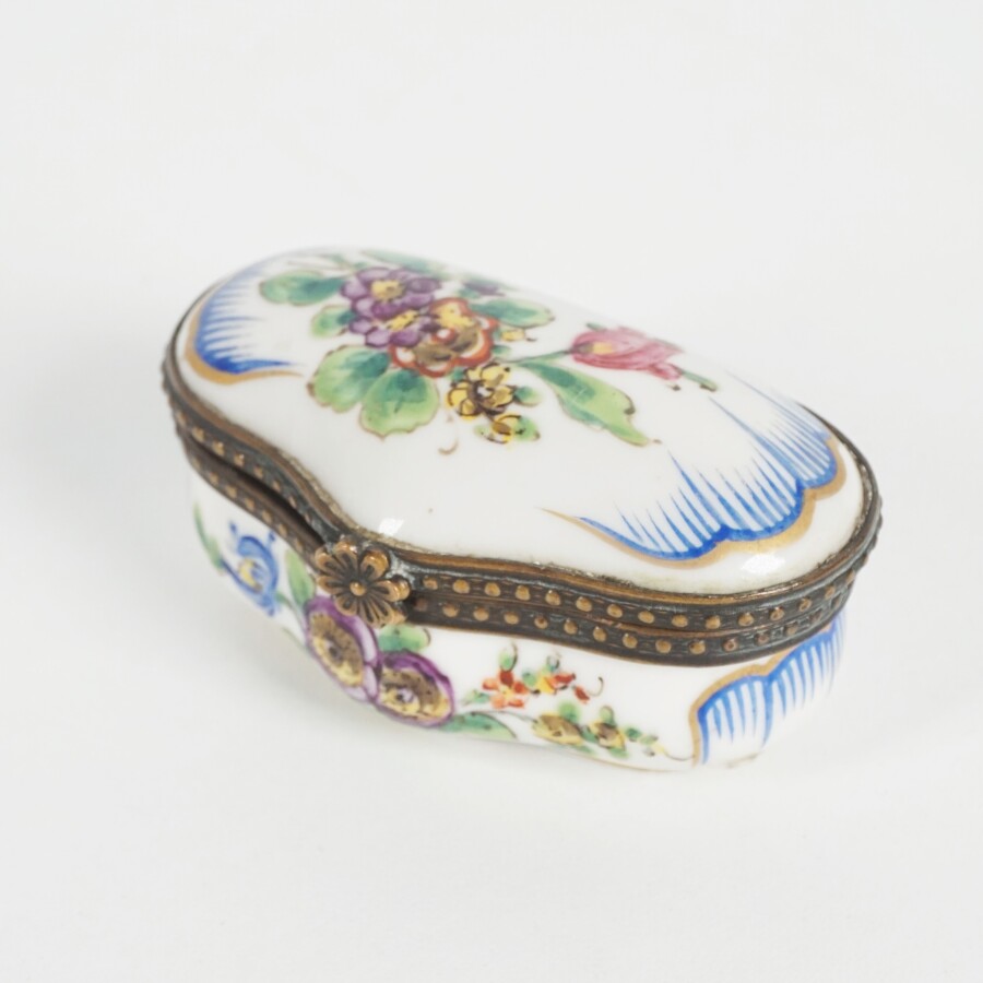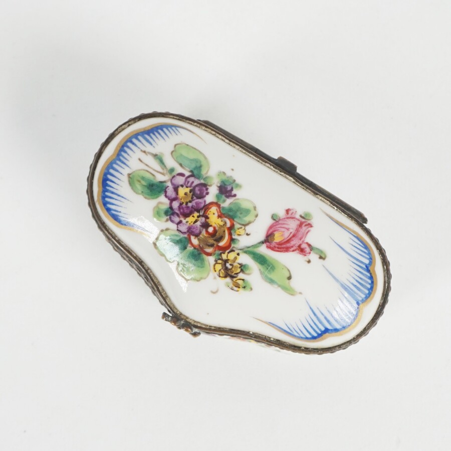 SAXE : Petite boîte à pilules en porcelaine émaillée polychrome à décor de fleurs, monture en métal, marqué en dessous, L. 6.5 cm.