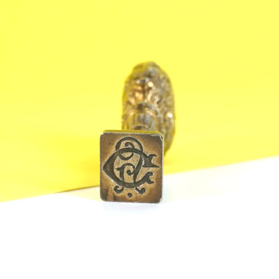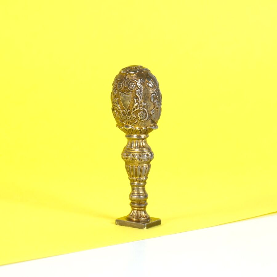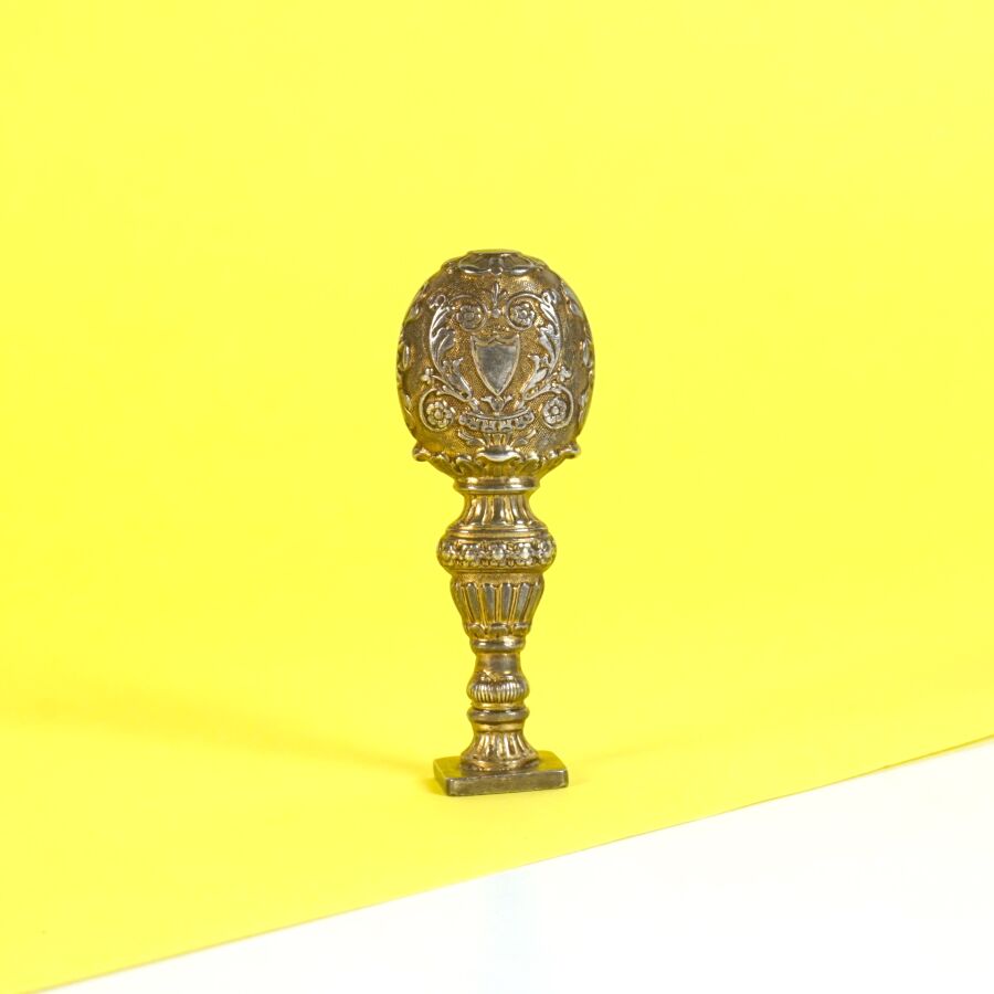 Sceau en argent (800/oo) partiellement doré à motif de fleurs encadrant un blason, H. 5.2 cm. Poids brut : 10.8 g environ.