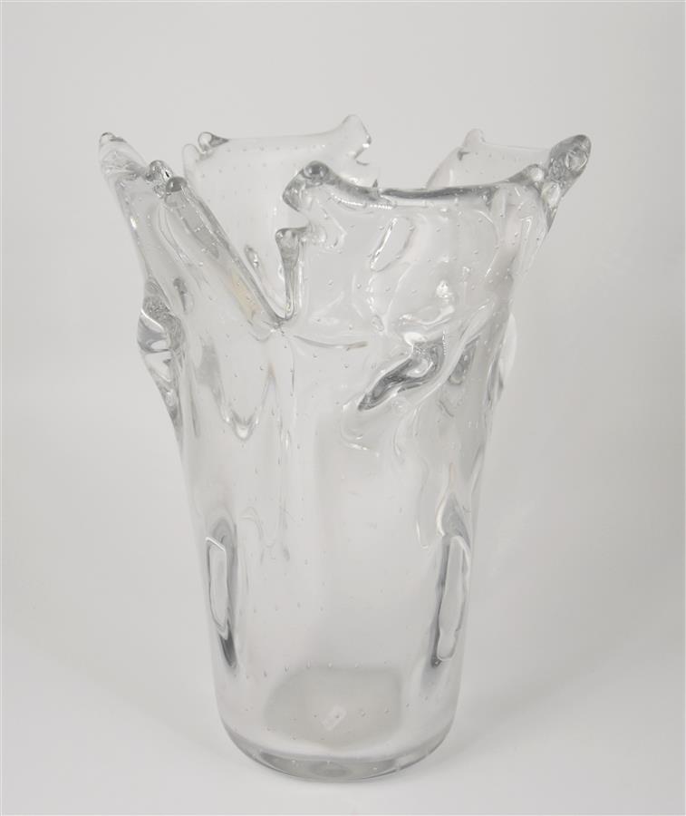 SCHNEIDER : Grand vase en verre transparent à décor de bulles, le col "déchiré", signé "Schneider France" au-dessous, H. 33 cm