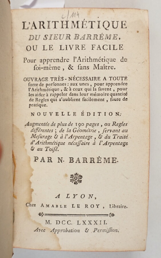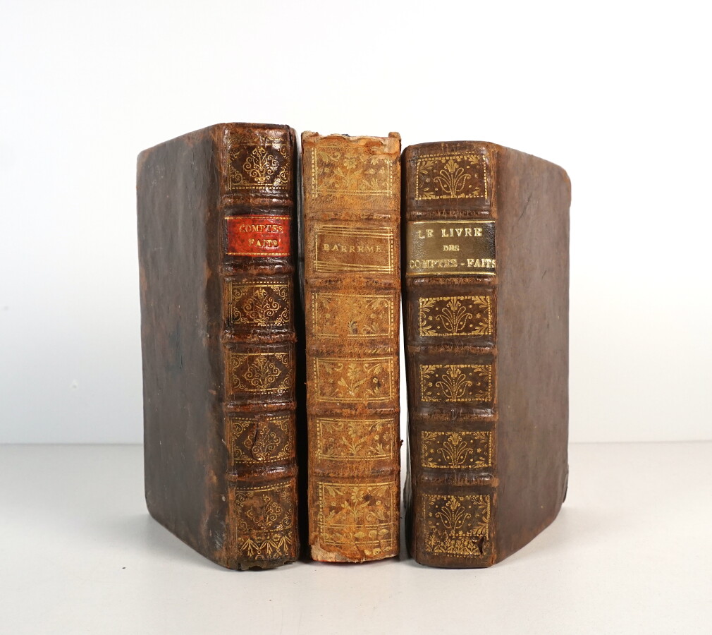 [SCIENCES] - Ensemble de 3 volumes : BARRÊME (N.) - Comptes-faits de F. Barrême. Le livre facile des comptes-faits, avec lequel on peut faire toute sorte de compte des Monnoyes tant anciennes que nouvelles [] - Paris ; Veuve Massé et Barrême, 1704 - 1 volume In-12° - Pâle auréole aux 6 premiers feuillets - Titre gravé, 1 écusson gravé hors texte - Reliure de l'époque veau brun (plats légèrement frottés, tache d'encre noire au 2nd, début de fente au 1er mors) - Dos à nerfs orné (coiffe inférieure accidentée) - Pièce de titre maroquin orangée (refaite) - Tranches mouchetées de rouge - DU MÊME - L'arithmétique du sieur Barrême pour apprendre l'arithmétique de soi-même, & sans maître [] - Lyon ; Amable Le Roy, 1782 - 1 volume In-12° - Auréole en marge interne des 6 premiers feuillets - Des opérations et figures gravées in texte - Reliure de l'époque basane havane marbrée (épidermures avec petits manques aux plats, coins et parties de coupes usés) - Dos à nerfs orné (passé uniformément, coiffes arasées avec petits manques aux caissons) - Pièce de titre maroquin beige - Tranches rouges - DU MÊME - Le livre des comptes-faits, ou le tarif général de toutes les monnoyes d'or & d'argent [] - Paris ; Veuve Macé, 1722 - 1 volume In-12° - Frontispice gravé (quasi détaché) - Reliure de l'époque veau brun (2 coins usés) - Dos à nerfs orné - Pièce de titre refaire - Tranches rouges - Des ex-libris manuscrits anciens.