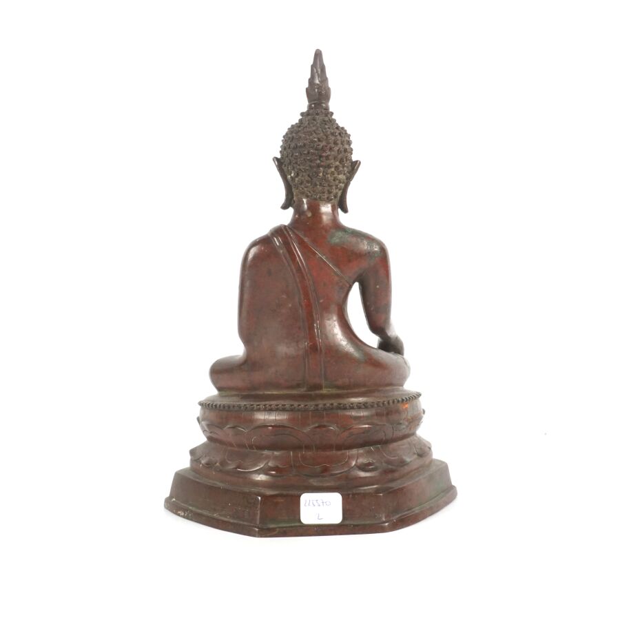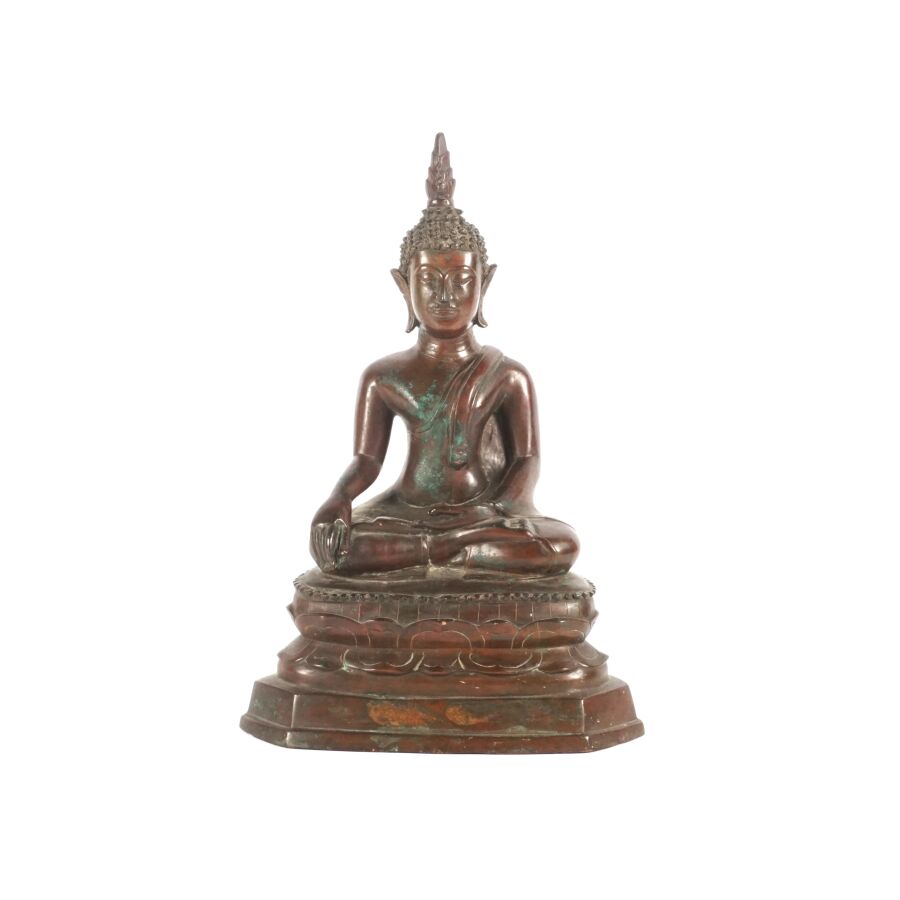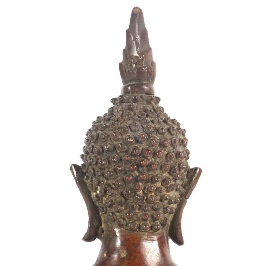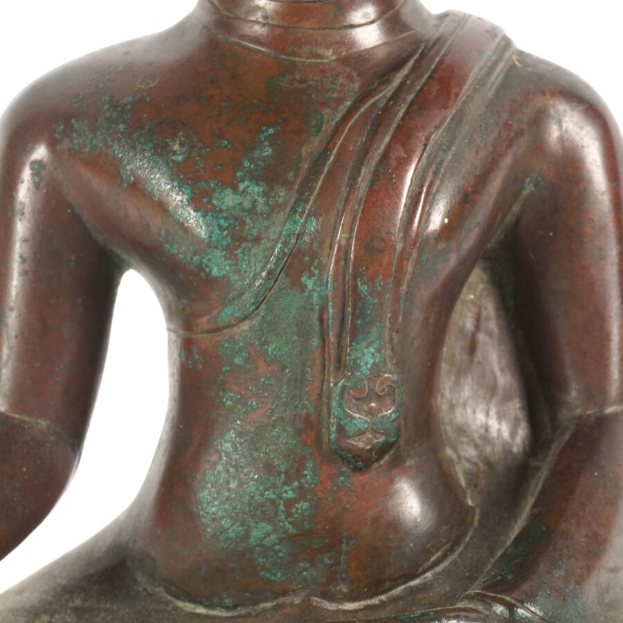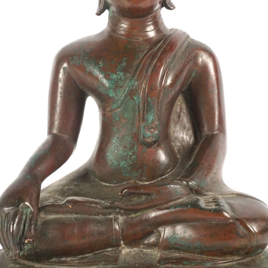 Sculpture en bronze, de patine brune représentant bouddha assis en prise de la terre à témoin "bhumisparsha mudra", trace de polychromie, Laos, 18ème siècle, H. 26 cm (petites traces d'oxydation).