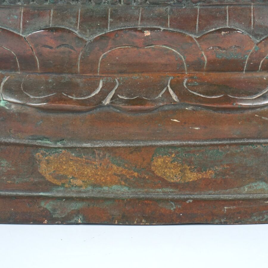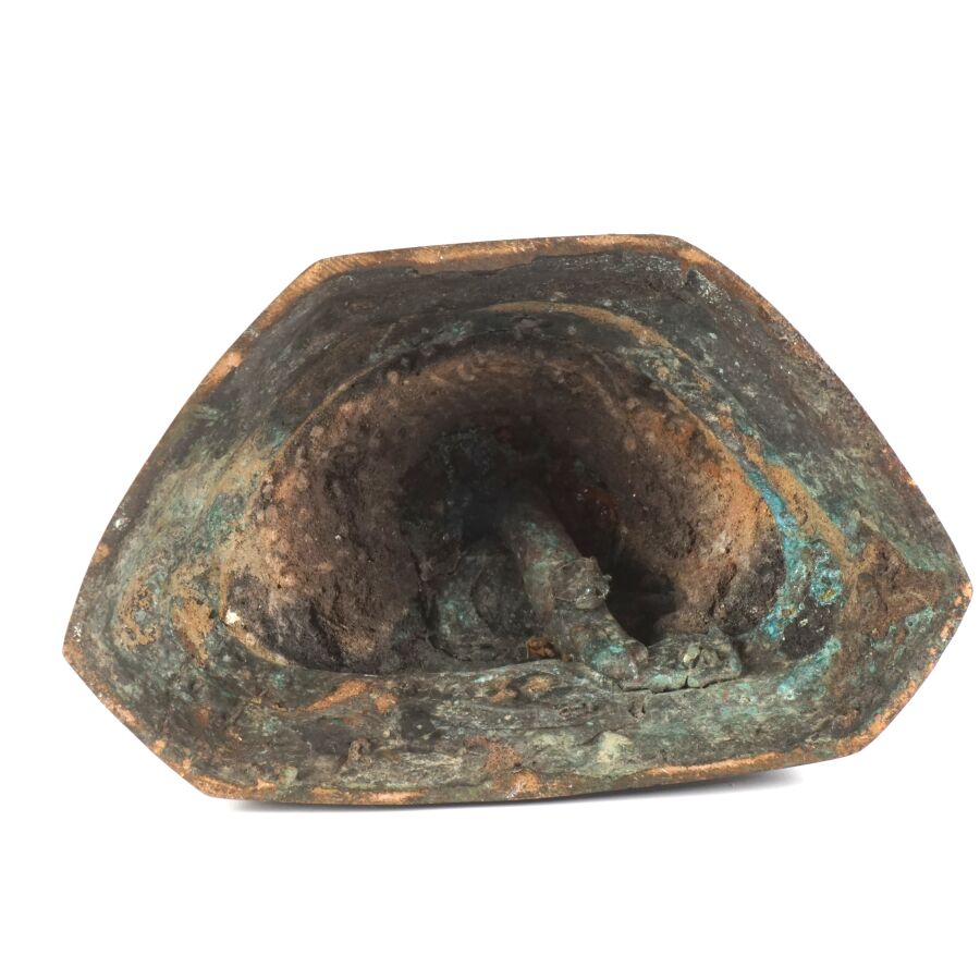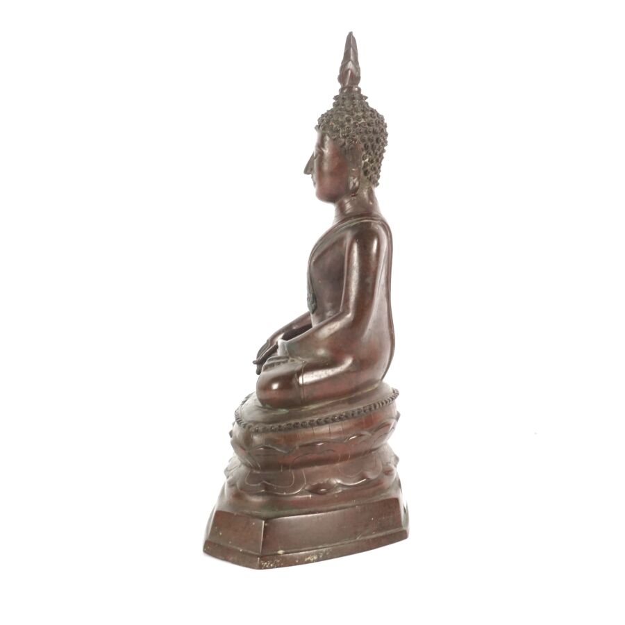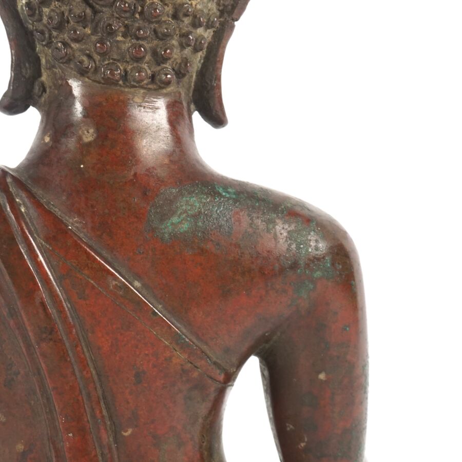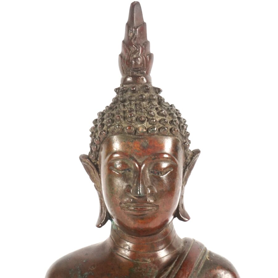 Sculpture en bronze, de patine brune représentant bouddha assis en prise de la terre à témoin "bhumisparsha mudra", trace de polychromie, Laos, 18ème siècle, H. 26 cm (petites traces d'oxydation).