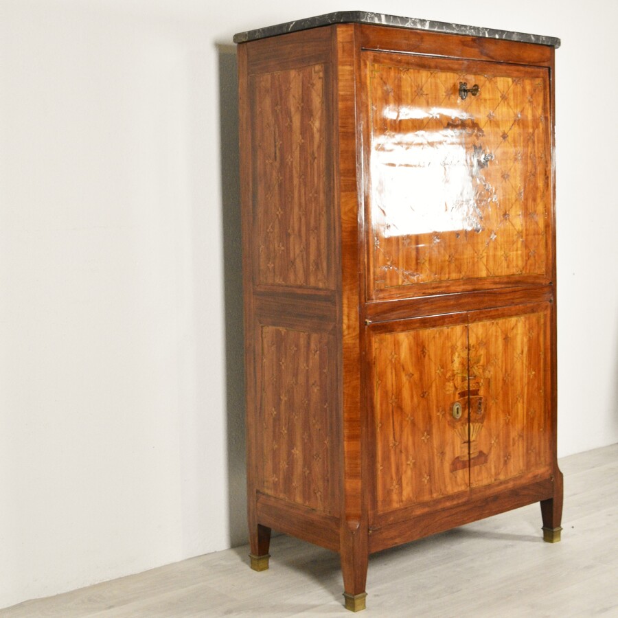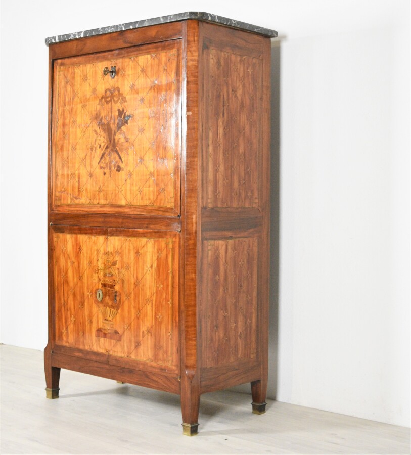 Secrétaire à pans de style Louis XVI en bois de placage, à décor marqueté toutes faces de croisillons à fleurettes stylisées, ouvrant à un abattant orné d'un trophée noué découvrant 6 tiroirs et 4 casiers, le plateau gainé de cuir havane estampé au petit fer, ouvre en partie basse à 2 vantaux ornés d'un vase godronné fleuri, entrées de serrure perlées en laiton, il repose sur un piétement gaine chaussé de sabots, il est coiffé d'un marbre noir veiné, parties anciennes, remontage moderne, 85 x 45 x H. 146 cm (une clé, intérieur mobile probablement rapporté petits manques au placage, une entrée de serrure à refixer, éclats et rayures au marbre).
