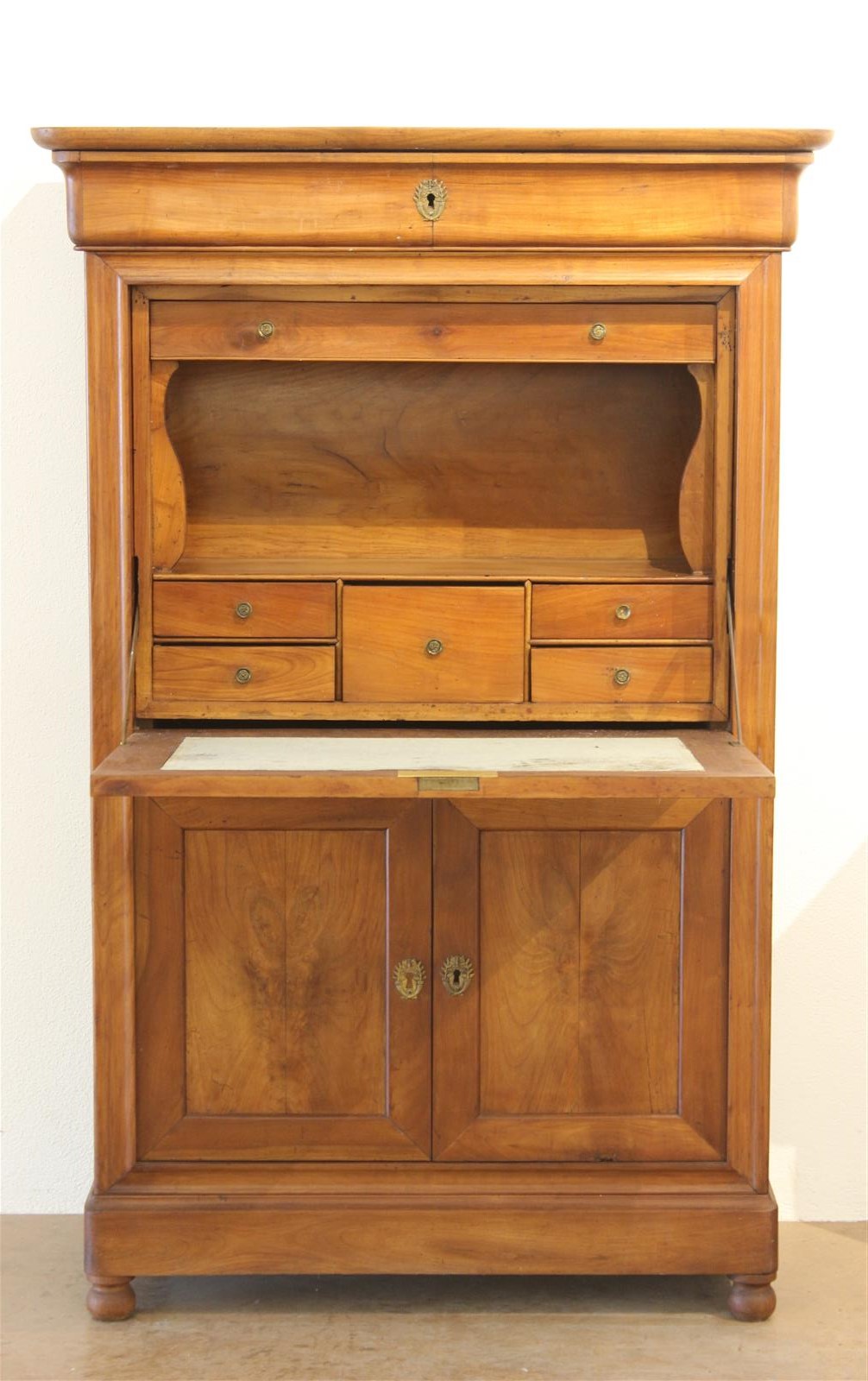 Secrétaire de style Louis-Philippe en bois de placage ouvrant en partie haute à un tiroir et un abattant découvrant un théâtre présentant 6 tiroirs, la partie basse ouvrant à deux vantaux, 98 x 36 x H. 146 cm (en l'état)