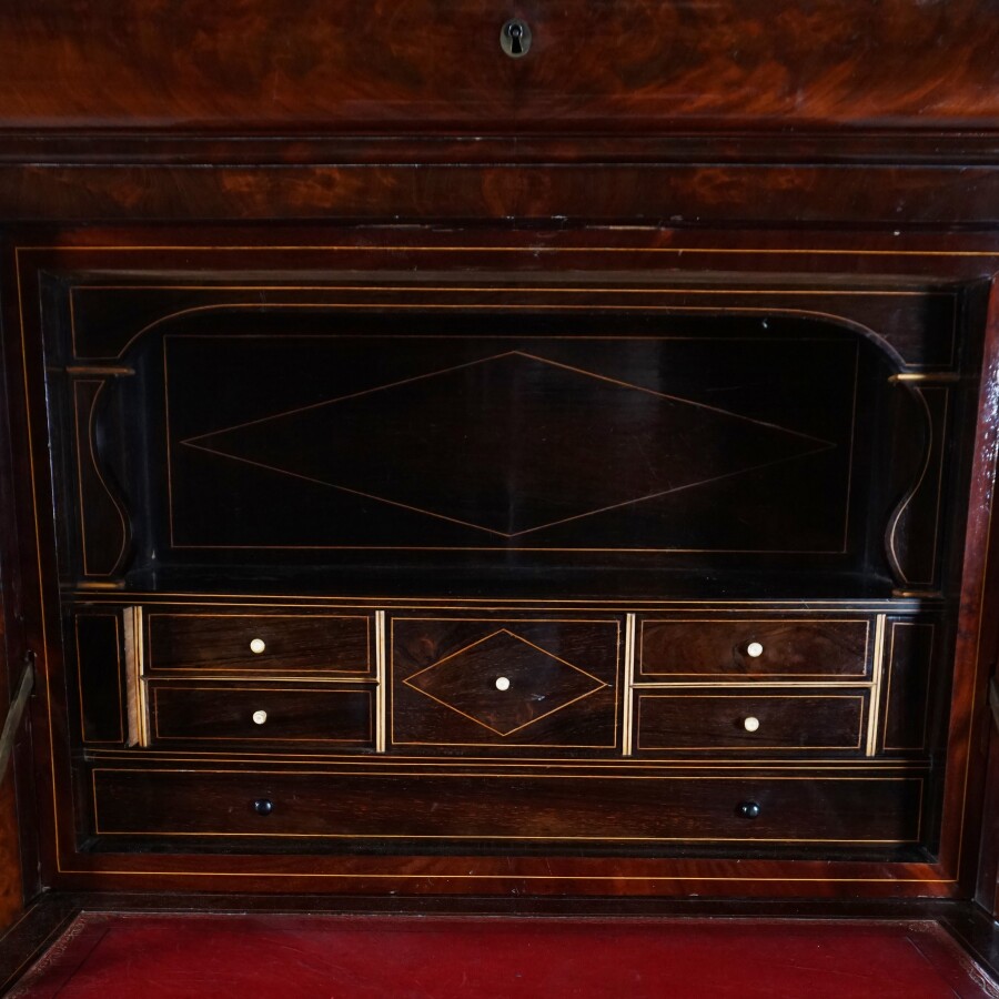 Secrétaire en placage d'acajou flammé et placage de palissandre, ouvrant à un tiroir en partie haute, un abattant découvrant 6 tiroirs sur trois rangs, un casier secret sur le côté gauche et un plateau gainé de cuir rouge estampé à l'or, la partie basse ouvrant à 3 tiroirs, 19ème siècle, coiffé d'un marbre gris, H. 143 cm (avec clé, usures, éclats au marbre).