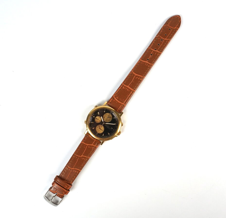 SEIKO : Montre "Chronograph", boitier rond en métal doré, 37 mm, cadran, fond noir, 3 compteurs, dateur à 3h, signé et numéroté 271125, bracelet similicuir havane rapporté, boucle ardillon.