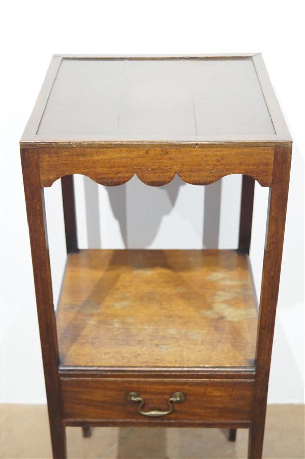 Sellette carrée en bois de placage, ouvrant à un tiroir au niveau de la tablette d'entrejambe, H. 90.5 cm, 36 x 36 cm