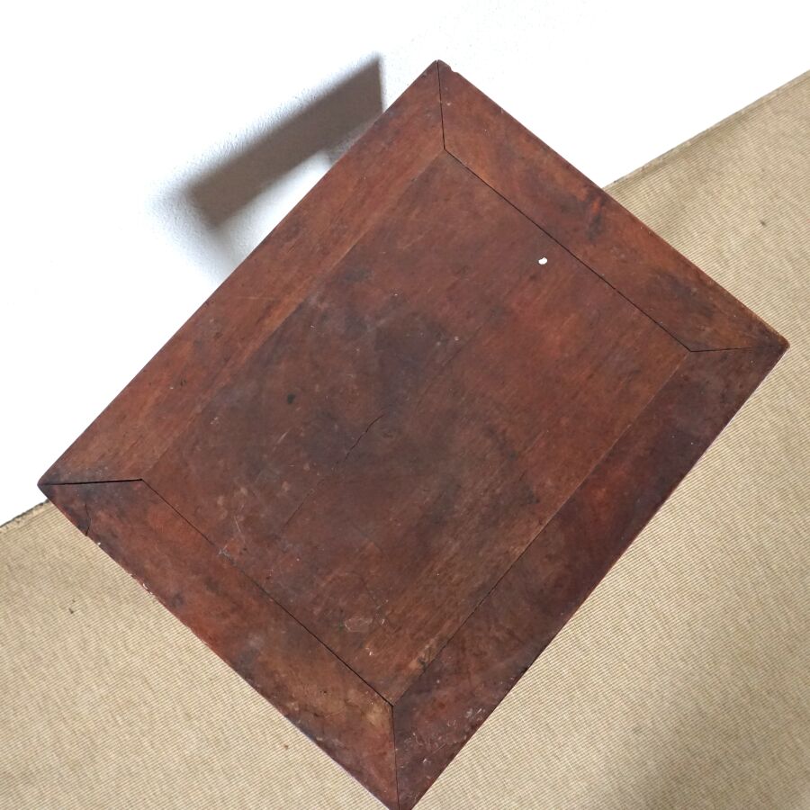 Sellette de forme quadrangulaire en bois sculpté, ceinture à décor gravé, tablette d'entretoise, Extrême-Orient, début du 20ème siècle, 82 x 43.5 x 34.5 cm (usures, rayures, fentes).