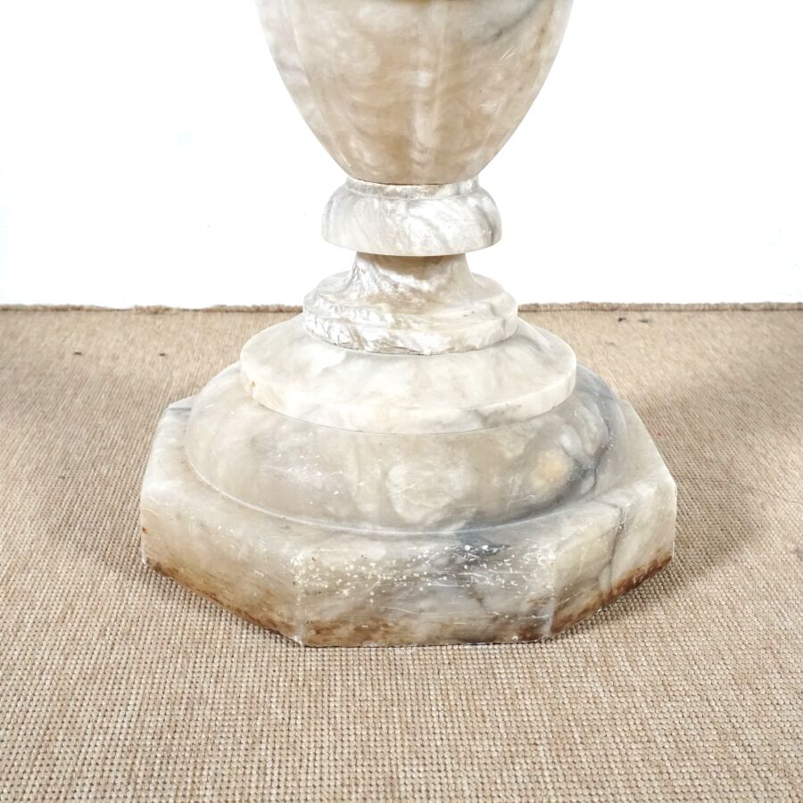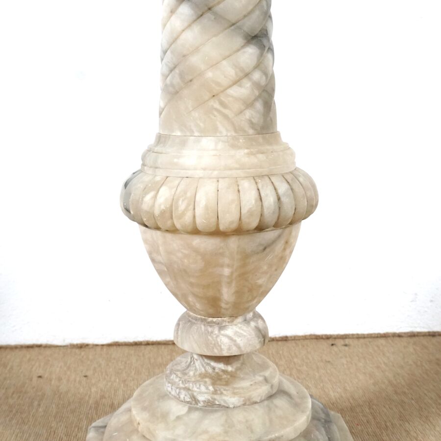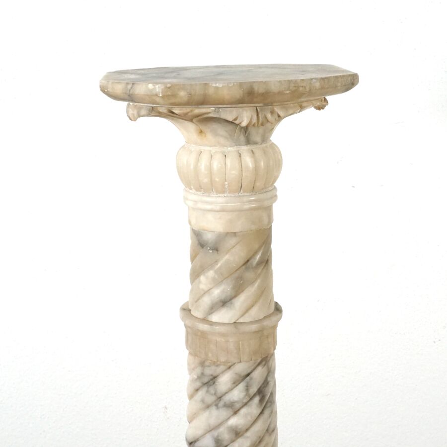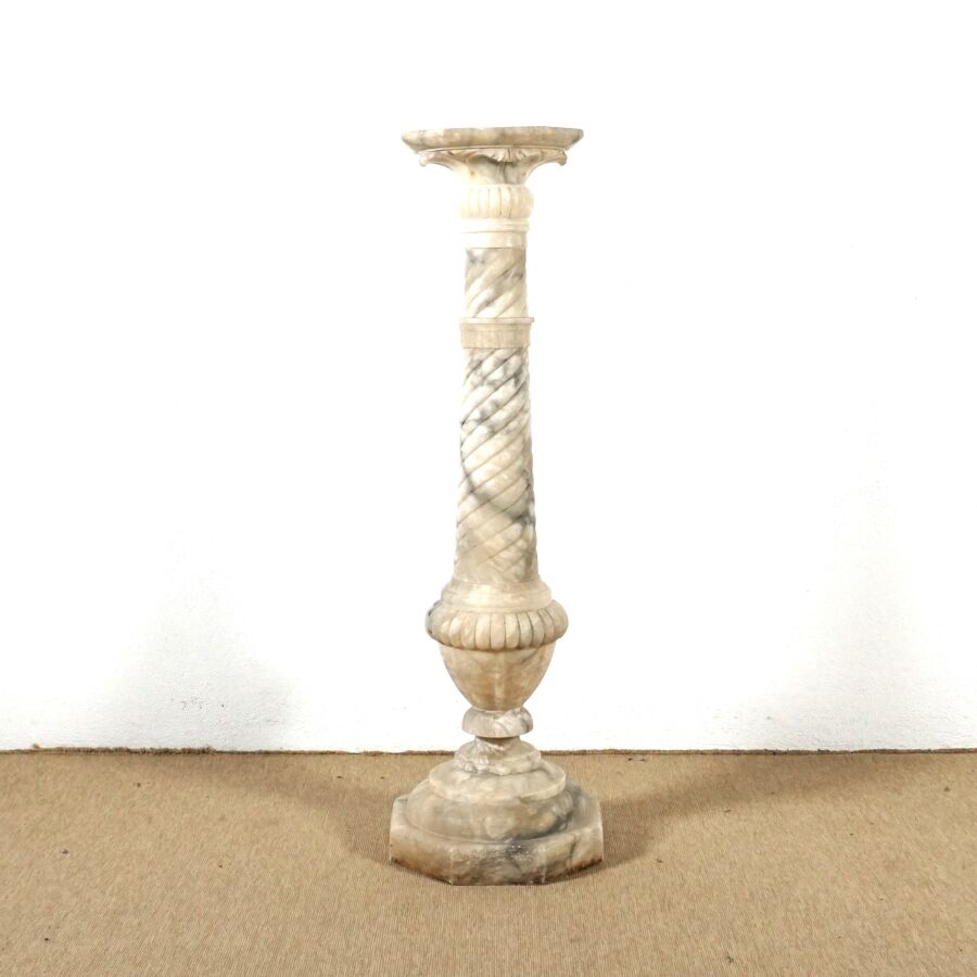 Sellette en albâtre blanc veiné gris à motif d'une colonne torse et bague de godrons, base et plateau à pans coupés, H. 107 cm. Dim. Plateau : 25.7 x 25.9 cm (éclats).