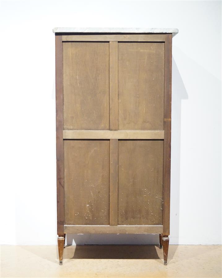 Semainier de style Louis XVI en bois teinté et placage, 4 pieds fuselés et cannelés, montants à colonne cannelée, anneaux de tirage et entrée de serrures en bronze doré à décor de rosaces, frises perlées et noeuds de ruban, plateau de marbre gris Sainte-Anne, H. 151.5 cm., L. 79 cm., P. 40 cm.