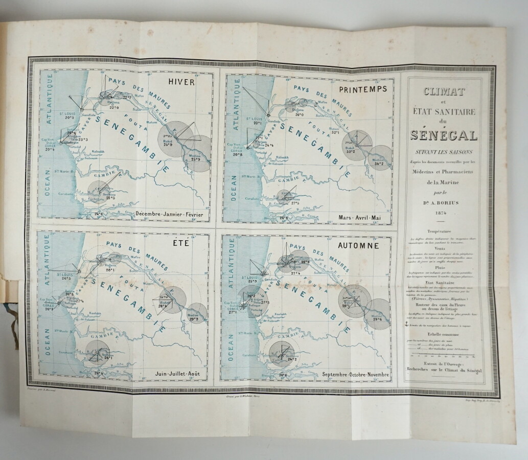 [SÉNÉGAL] - BORIUS (A.) - Recherches sur le climat du Sénégal - Paris ; Gauthier-Villars, 1875 - 1 volume In-8° - Tableaux météorologiques, 14 planches in texte et 1 carte en couleurs du climat et de l'état sanitaire du Sénégal suivant les saisons - Reliure de l'époque demi-basane noire - Dos lisse orné et titré or (frotté et accroc en coiffe inférieure) - Envoi autographe signé de l'auteur au faux titre - Bon intérieur.