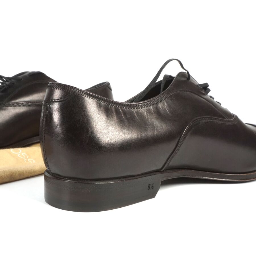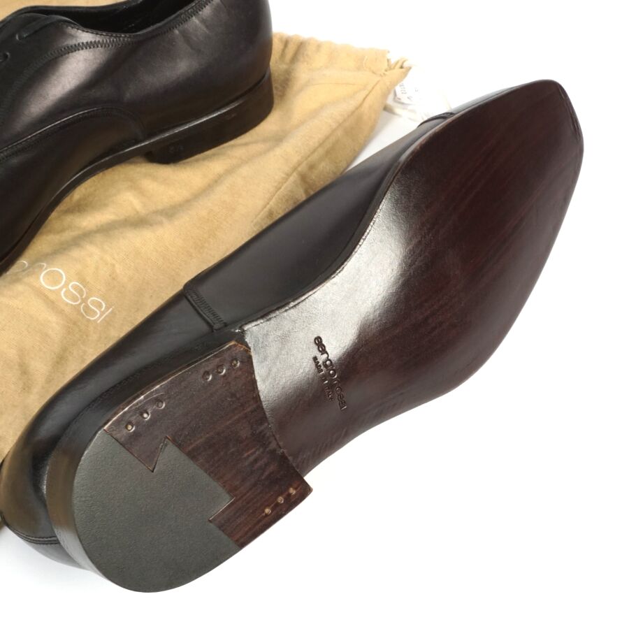 SERGIO ROSSI : Paire de chaussures style Richelieu en cuir de couleur noir, lacets noirs, bout rond uni, semelles bois, pointure indiquée 8 1/2 (42.5), présentée avec sa housse d'origine, L. Semelle : 30.6 cm.
