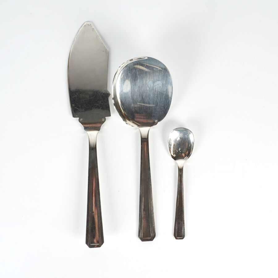 Service à dessert en métal argenté comprenant : 1 pelle à tarte, 1 cuillère de service à glace et 12 petites cuillères à glace, présenté en coffret, L. Pelle : 27 cm. L. Cuillère : 13.5 cm.