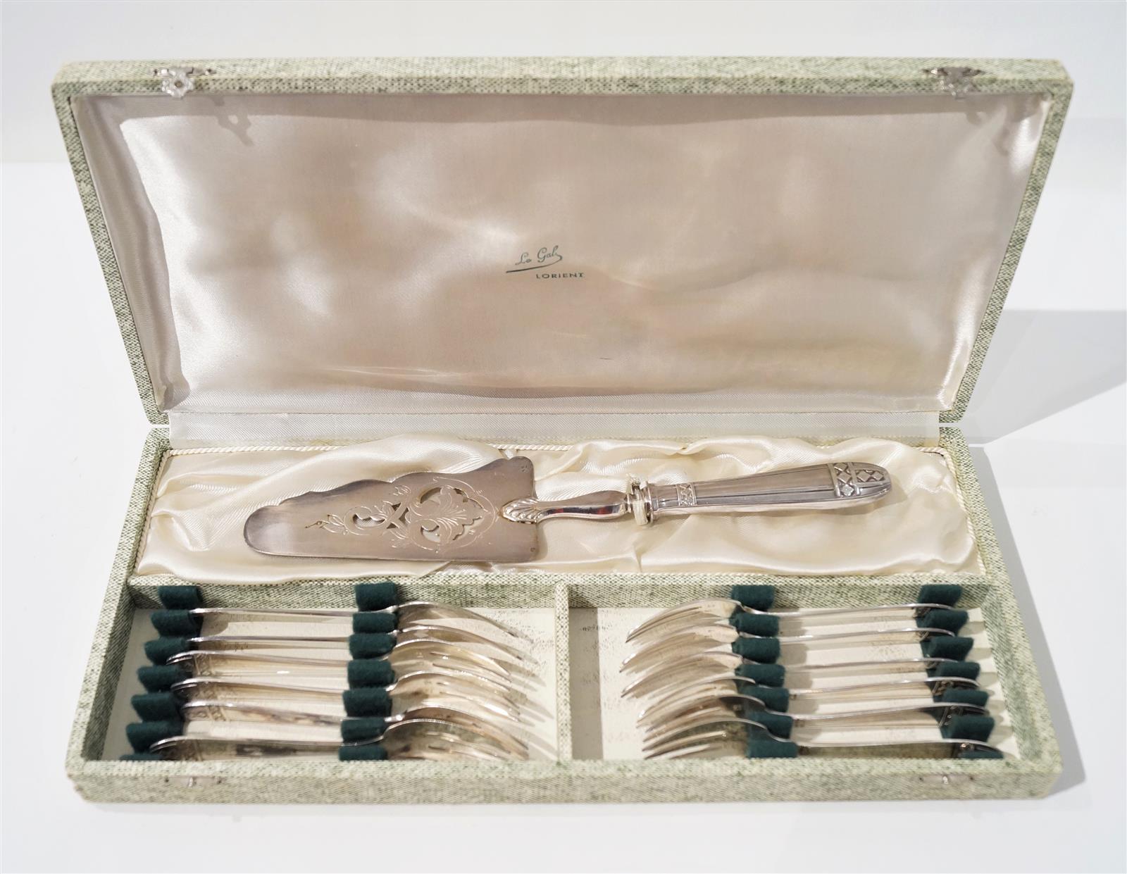 Service à gâteaux circa 1940 en métal argenté, à décor de fleurettes stylisées, comprenant un pelle ajourée, L. 28.5 cm, et 6 petites fourchettes, L. 14 cm.