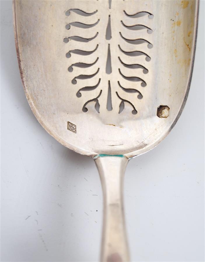 Service à petits fours 4 pièces en argent, poinçon Minerve, poinçon de MO "H.T" et une étoile, fin 19e siècle, présenté dans un coffret bois, L. des couverts : 19 cm environ. Poids brut : 153.26 g environ.