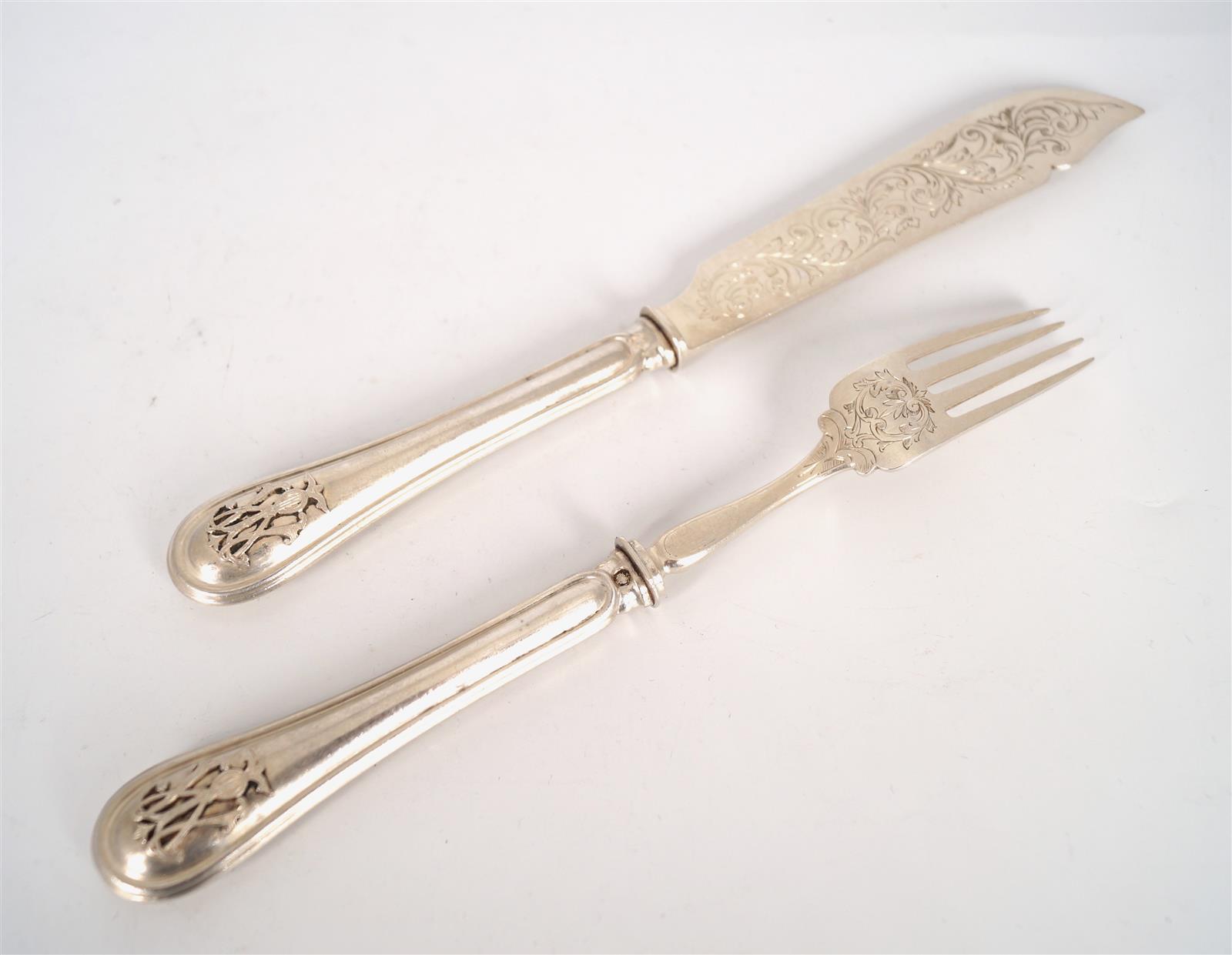 Service à poisson en argent, poinçon Minerve, les manches en argent fourré, comprenant 6 couverts de table et un couvert de service, à décor de fleurs et feuillages ciselés, L. 22.5 et 25.5 cm. Poids brut : 1 025 g environ.