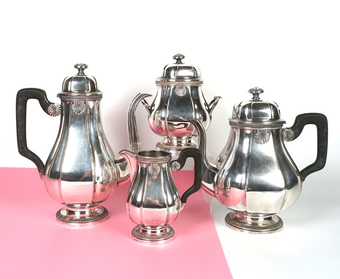 Service à thé-café 4 pièces en argent, poinçon Minerve, comprenant : cafetière, théière, pot à lait et pot à sucre, modèle à cotes pincées sur piédouche à décor de palmettes et de frises de godrons, les anses en bois noirci, H. de 13 à 26 cm. poinçon de MO difficilement lisible "QG" ou "OG" (?). Poids brut : 2 200 g environ.