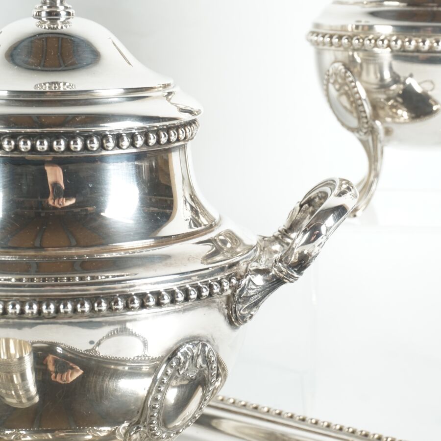 Service à thé-café en métal argenté à décor perlé, feuillages et palmettes, composé de quatre pièces, comprenant plateau de service, sucrier, pot à lait et verseuse, on joint deux ronds de serviette (petites traces infimes).
