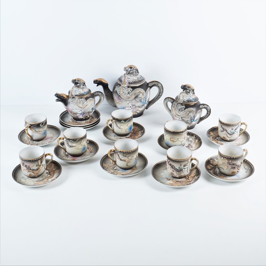 Service à thé - café en porcelaine à décor en léger relief et rehauts d'or de dragons évoluant parmi des nuages comprenant verseuse, pot à lait, sucrier, 9 tasses et 12 sous-tasses, Japon, travail moderne.