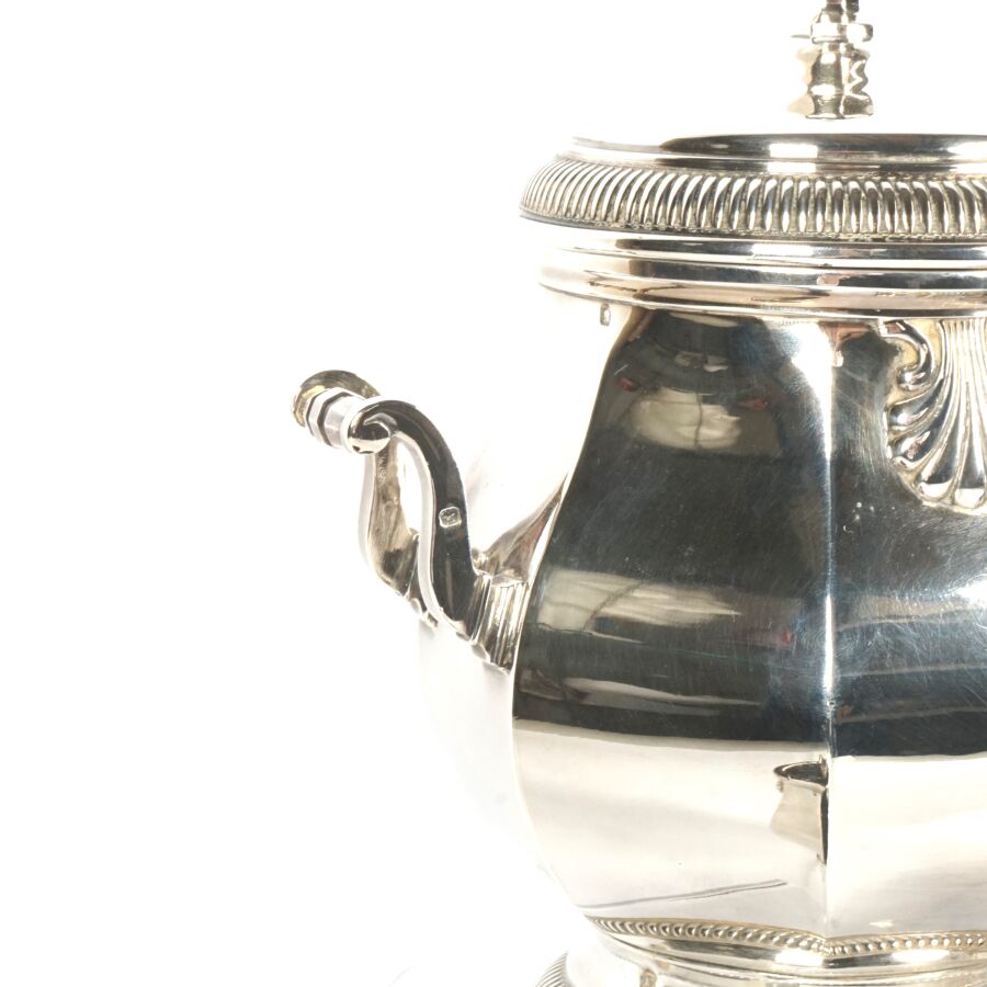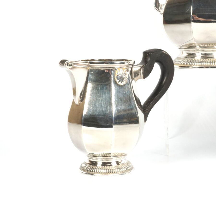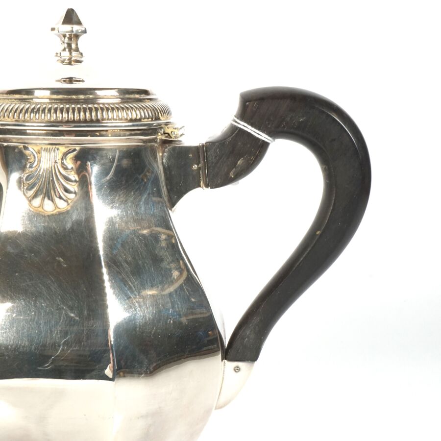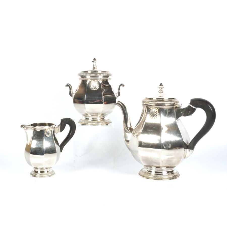 Service à thé-café trois pièces en argent, poinçon Minerve 1er titre, poinçon MO difficilement lisible "M&E", le différend figurant un cercle (?), à décor de coquilles et godrons, manches en bois noirci, comprenant une verseuse, un pot à lait et un sucrier avec son couvercle, Poids brut : 1 571 g environ.