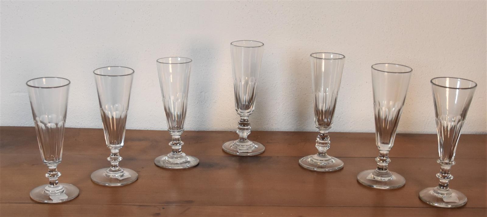 Service de 7 flûtes à champagne en verre côtelé, H. 16.5 à 18 cm