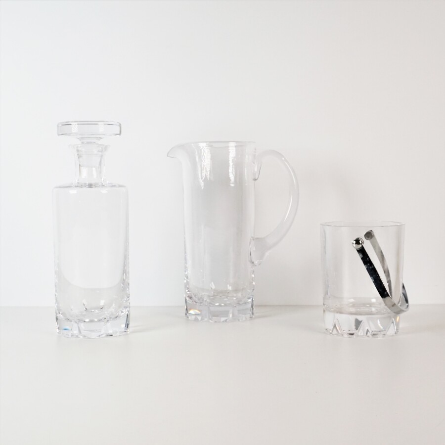 SEVRES : Ensemble en cristal comprenant une carafe avec son bouchon, un seau à glace et un pichet, marqués dessous du tampon de la manufacture, H. Carafe avec bouchon : 25.5 cm.
