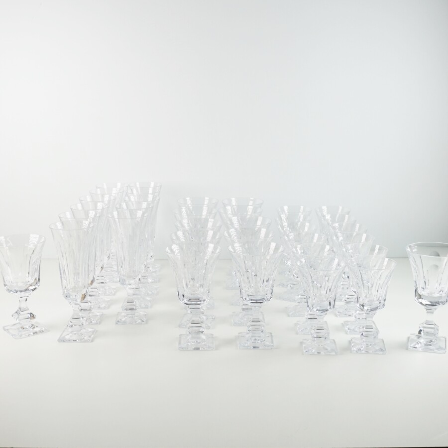 SEVRES : Service de verres en cristal, comprenant 12 verres à eau, 12 verres à vin rouge et 12 flûtes à Champagne, H. Flûte : 19 cm. H. Verre à eau : 15.8 cm. H. Verre à vin : 14 cm (une égrenure sur une flûte, un éclat à une seconde).