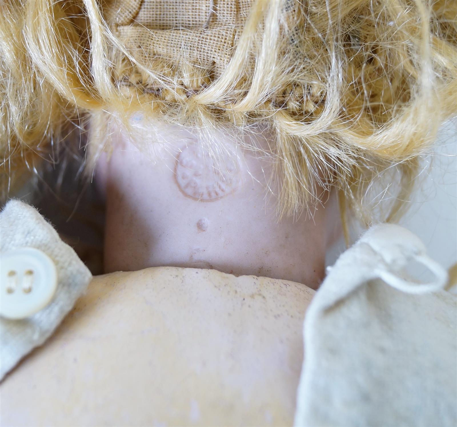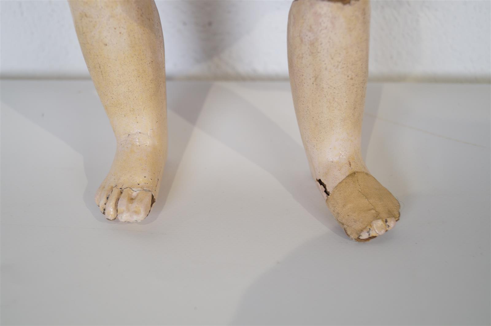 SFBJ : Poupée à tête en biscuit, bouche ouverte, oreilles percées, yeux bleus fixes, corps articulé en carton bouilli, H. 43 cm (une jambe à refixer, en l'état)