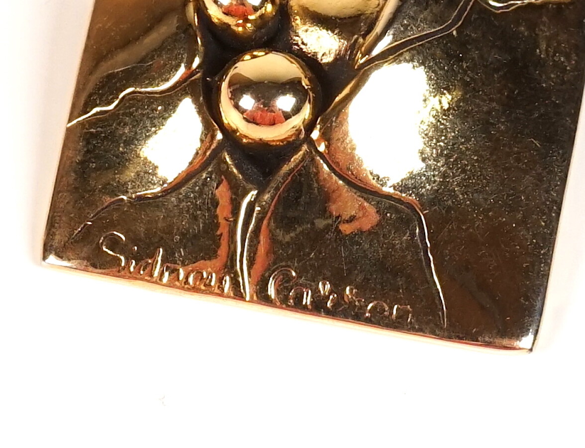 Sidney CARRON : Broche plaque de style moderniste en métal doré, signée, H. 6 cm.