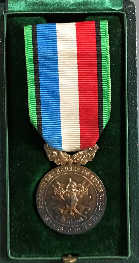 SOCIETE NATIONALE DE RETRAITES DE VETERANS DES ARMEES DE TERRE ET DE MER 1870-1871 - MEDAILLE D'HONNEUR DU SECOND TYPE (1905), en argent, poinçon " ARGENT " sur la tranche, jeton de 28,5 mm, ruban de 32 mm de large, bouton laqué noir de la Maison Arthus Bertrand, ECRIN, TBE.