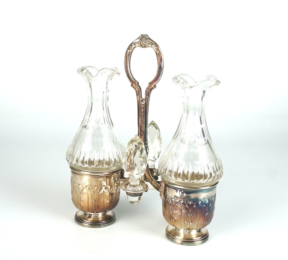 SOCIETE PARISIENNE D'ORFEVRERIE (1910-1914) : Huilier-vinaigrier en argent, poinçon Minerve 1er titre, la monture ornée de feuilles d'eau et accueillant deux flacons en verre (les bouchons probablement rapportés, l'un restauré), H. totale : 17 cm. Poids brut de la monture en argent : 121 g environ.