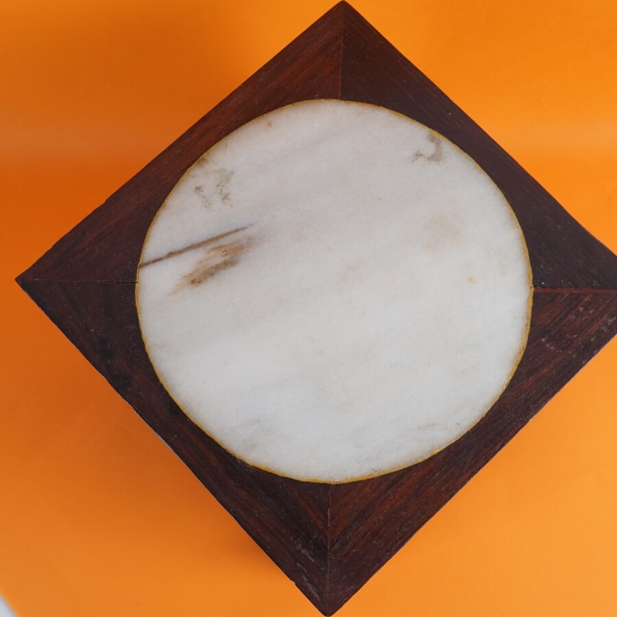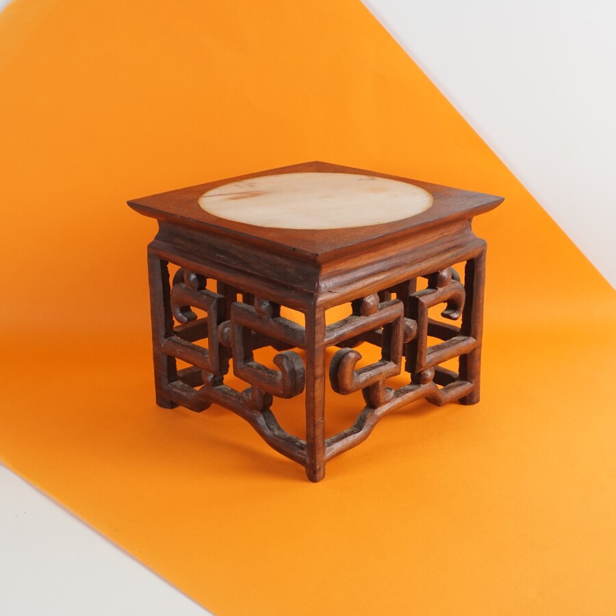 Socle de lettré, bois sculpté et ajouré, plateau ornée d'une pierre dure circulaire blanche-beige, Singapour, H. 12 cm x 14.3 x 14.5 cm.