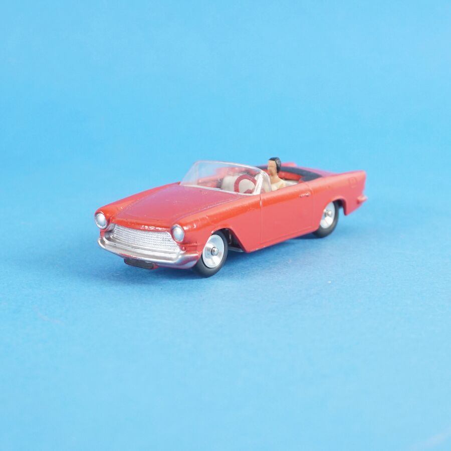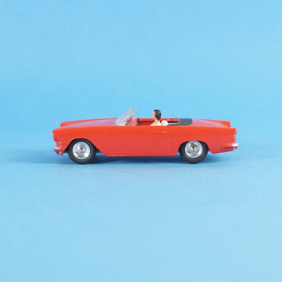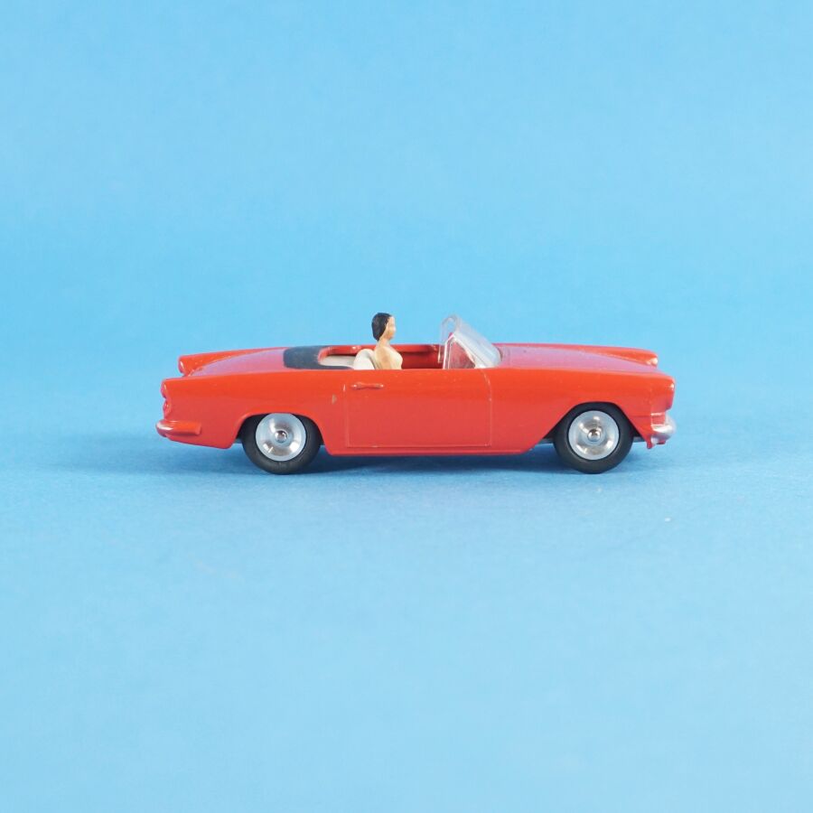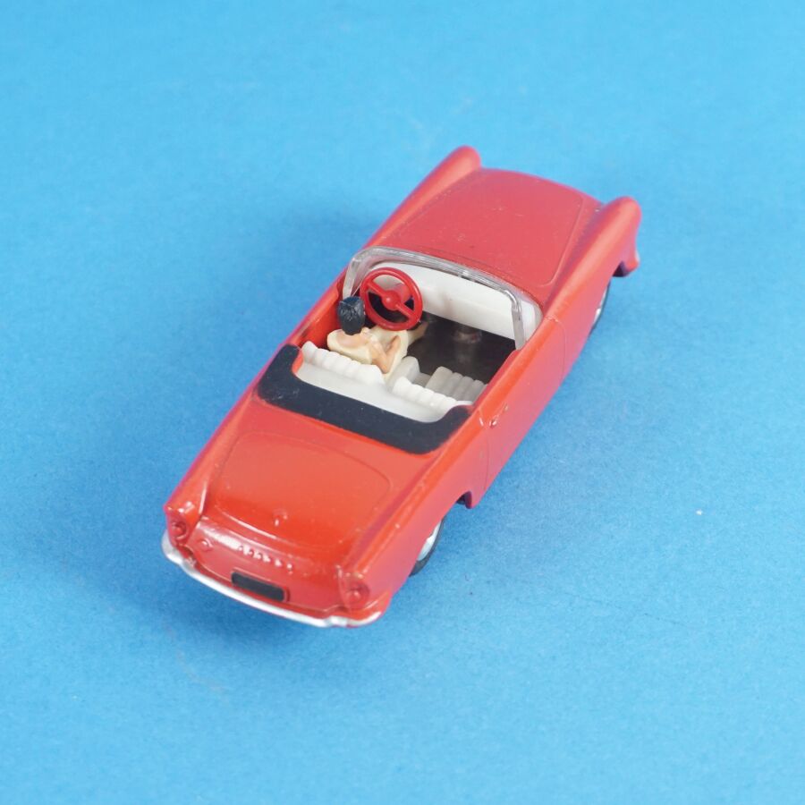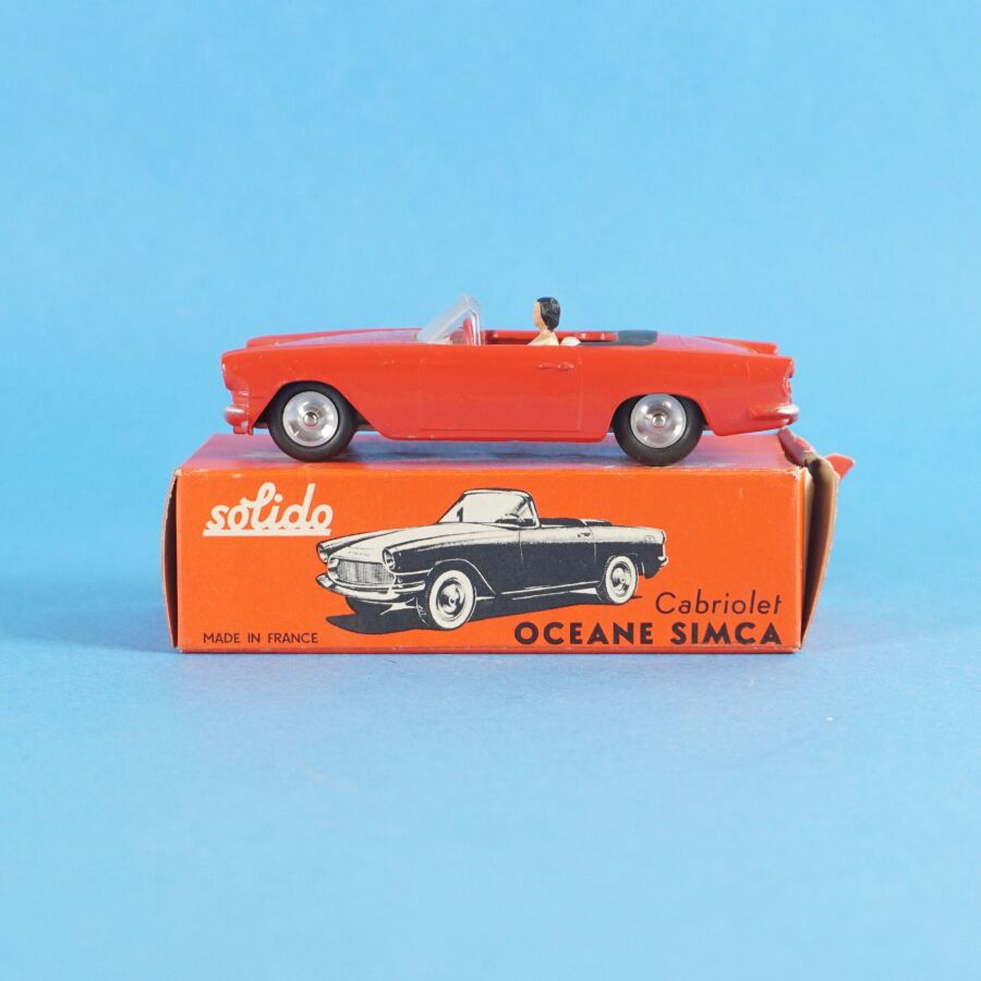 SOLIDO : Cabriolet "Océane" Simca, rouge, intérieur blanc, avec conductrice, dans sa boîte d'origine (boîte en l'état, déchirure, infimes traces à la peinture, étiquette Louis Vuitton dessous).